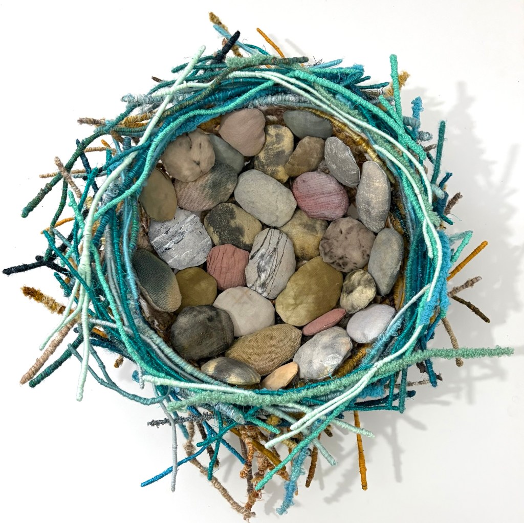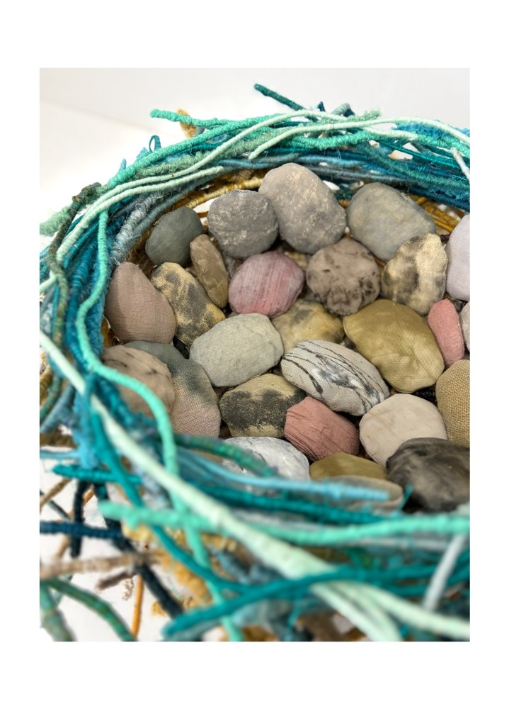 I had a dickens of a job doing the inside and the second attempt was a flop. Once I made the paper inside (which I might say took an absolute age) and finished it, I realised it was completely wrong. It looked incongruous against the yarns, I thought I wanted something almost opposite and smooth to contrast but, no. So after further wailing and gnashing of teeth I plopped a few pebbles I have in the studio into the nest just to see how they looked and voila! Which is incidentally why it’s recommended to have stuff about the place to help make connections when seeking ideas. Take heart, messy studio chums!
