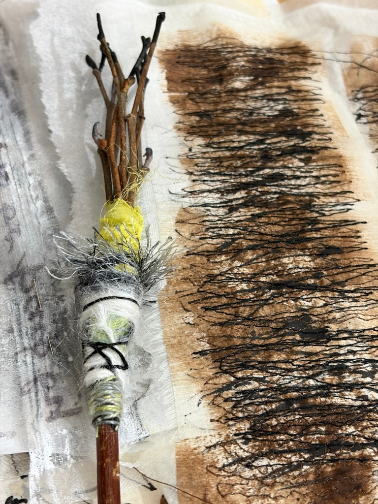 The other way I often use it is when I have a question about a potential relationship of ideas. One of the things I had read in that initial book was how people would use a tree directly to invoke its powers, so they would naturally dye material and threads, for example. I decided that for each tree I would try to use it physically in some way to be in keeping with the theme of talisman – not to go down any magical paths but rather because I would find it satisfying and fun. I am printing with different parts of a tree and making twig brushes to make marks, nothing new there. However, as mentioned, there is something special about creating an object and using it. Many of us love to wrap colours and fabrics to create an attractive brush that relates back to our inspiration. We adorn them and in some way, the brushes seemed to relate to being talismans.