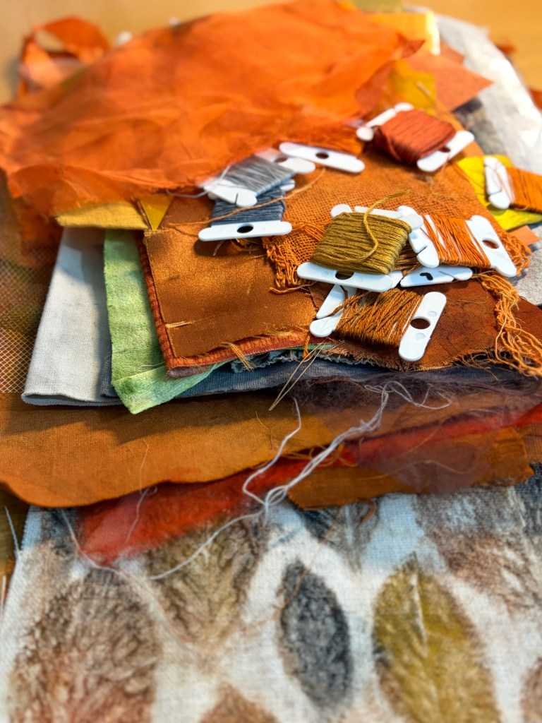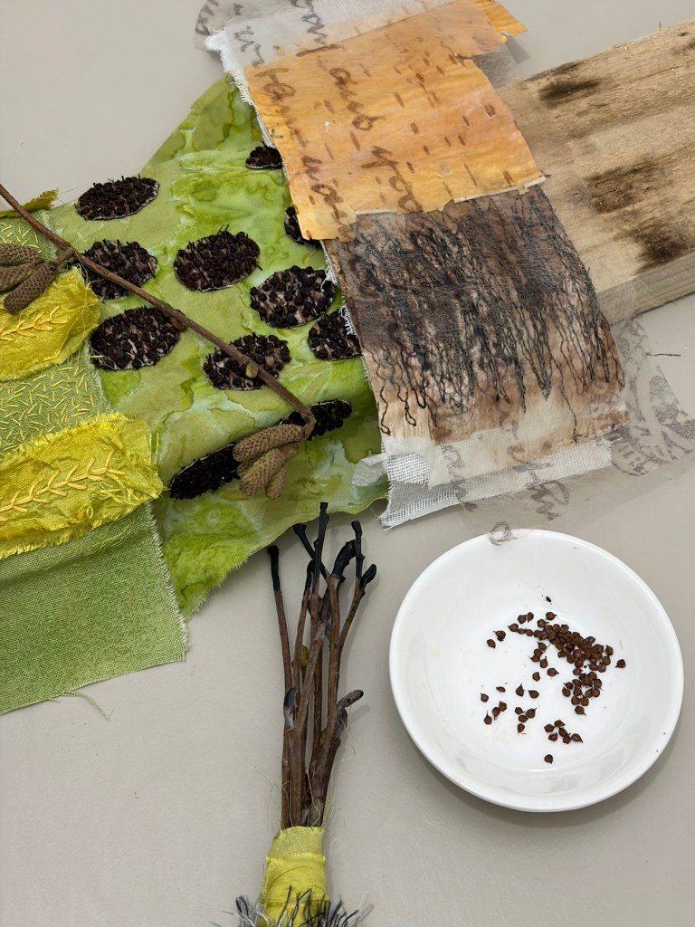 I started by thinking about the sycamore behind our garden fence. It symbolises a sense of place and stability and it seemed a good starting point having recently moved and feeling happy and settled here. I have always been aware of a strong feeling of place in my work, usually home. Then comes the criss-crossing of the what’s and how’s of making a piece and my thoughts expanded to exploring several common trees. This is where AI came in, as I was able to ask it to compare and summarise characteristics and colours of seven different trees. I knew colour was one aspect of theme that I would enjoy as well as the symbolism behind each tree and thus emerged two ‘threads’ (pardon the pun) for each. I asked Chat GPT to produce a summary table I could print off with the comparisons and it’s been so useful in my sketchbook to refer back to and to keep me on track as I’m making all the small fragments of tree bits I want.