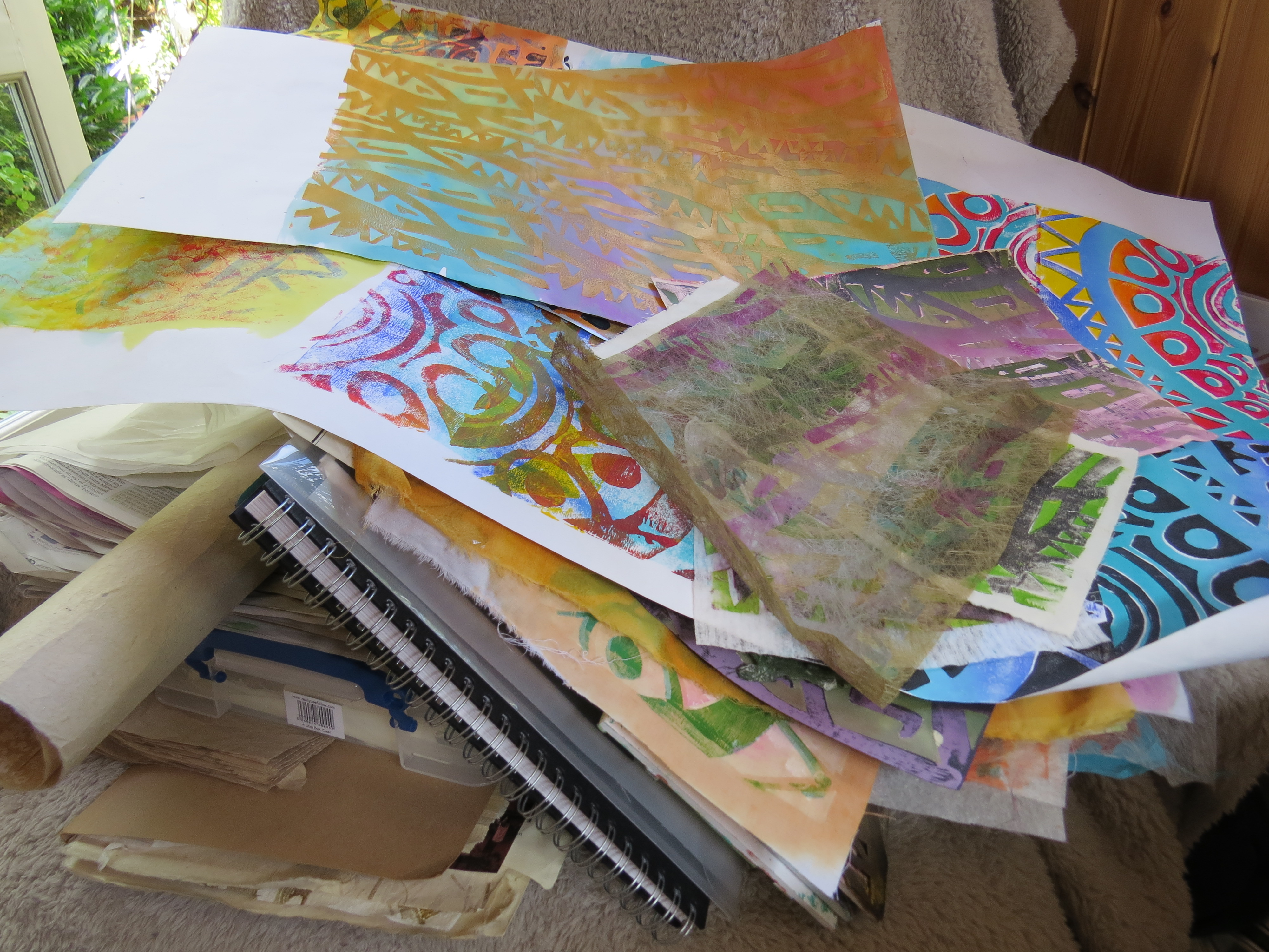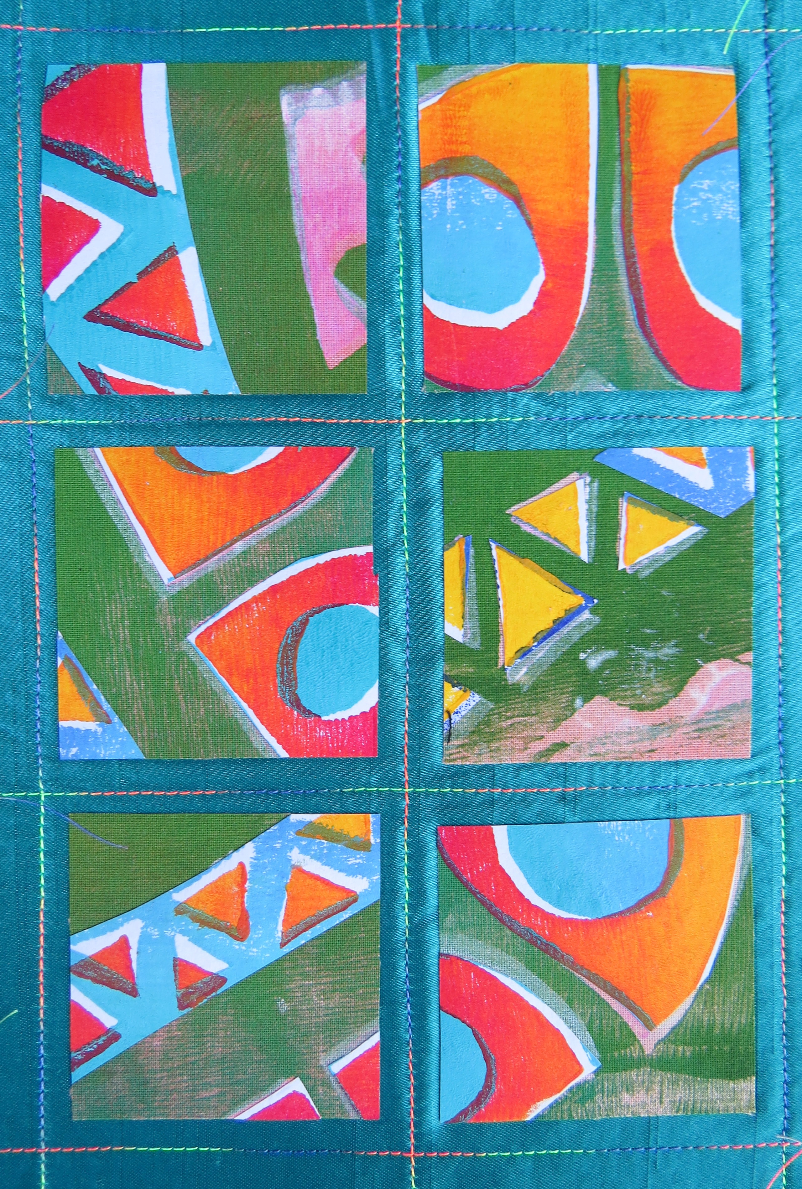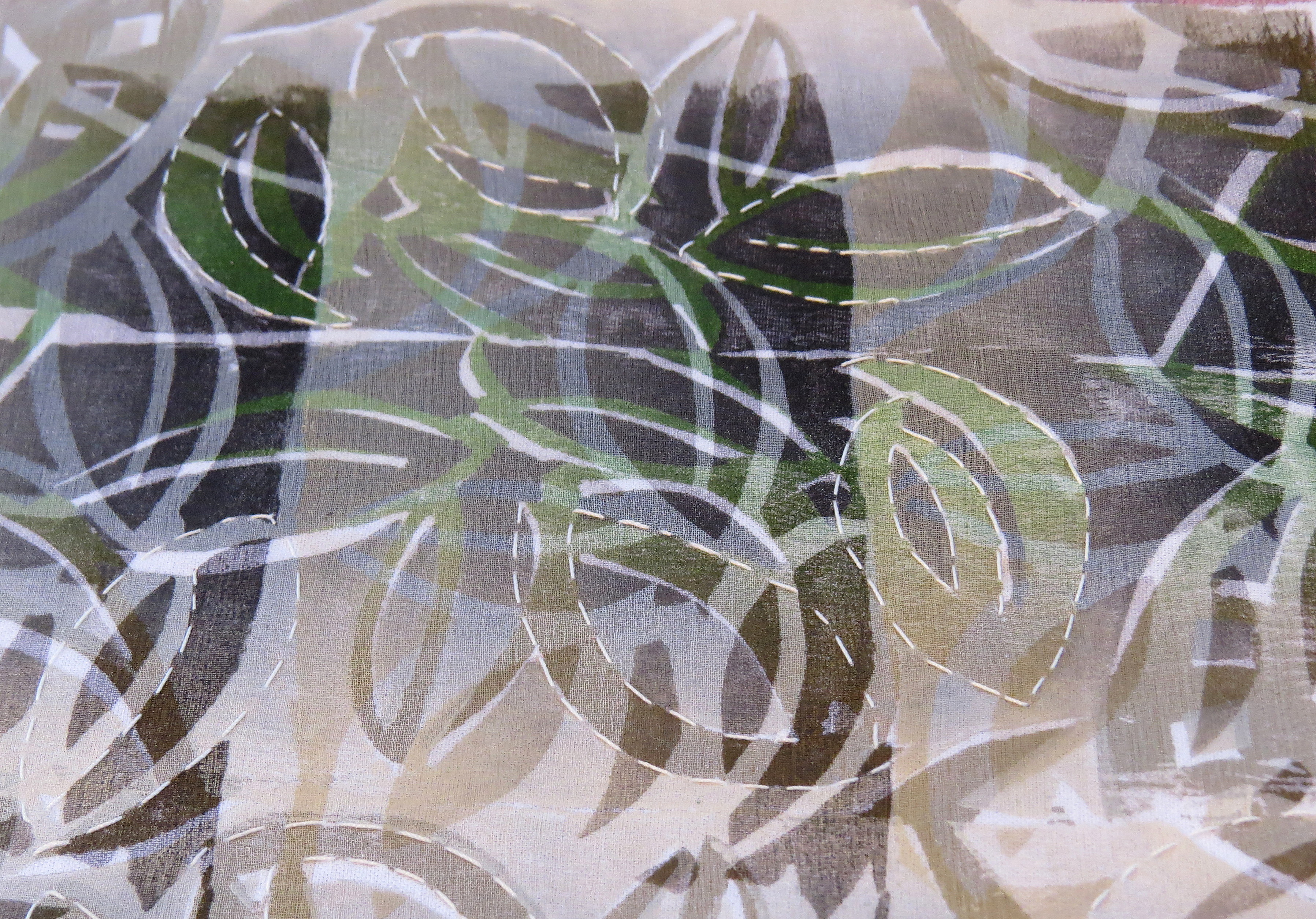 This time we are printing, overprinting, cutting back and stitching and generally experimenting. Having used several block prints, some I love and some are rather restricting and I’m not too sure what to do with the strong design.