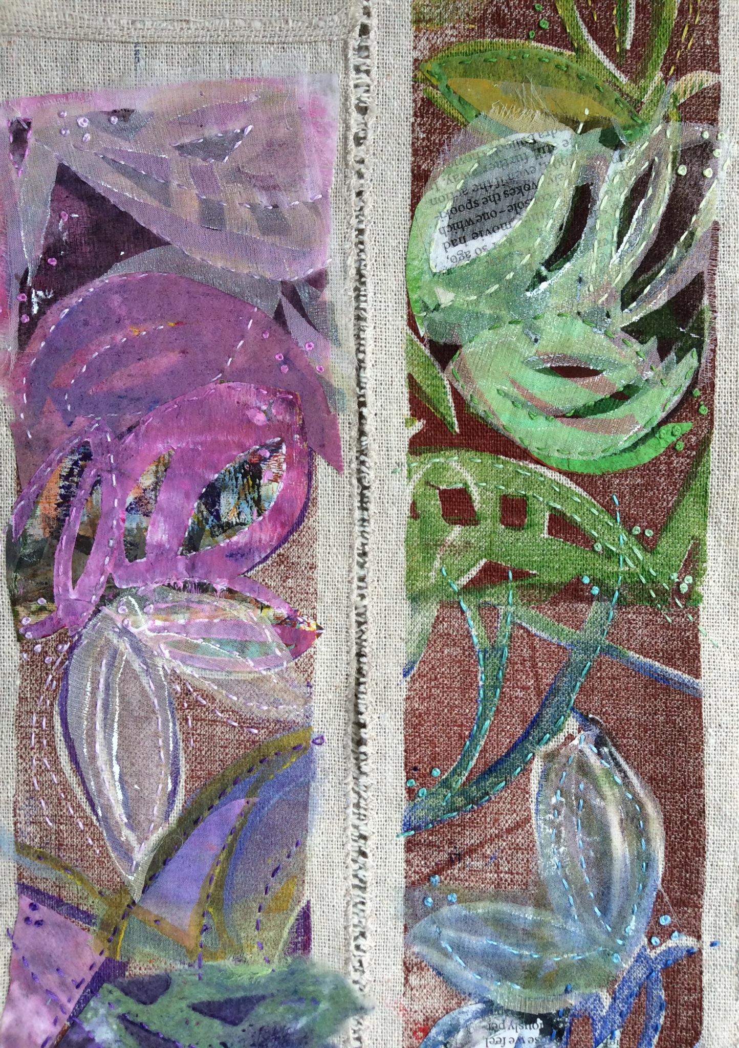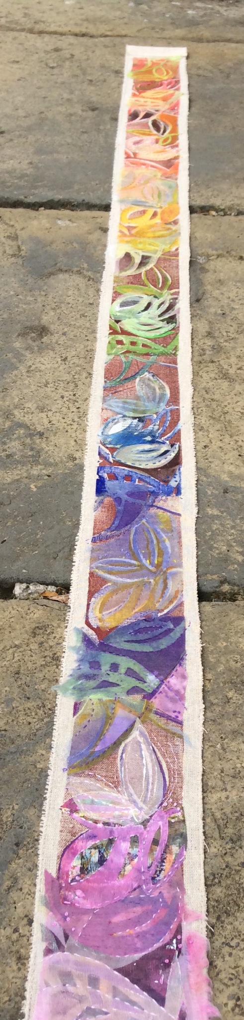 My printed and stitched strip is now done, just in time to take next weekend. It’s a bit hard to show complete so here are a couple of sections, my favourite bit, and the whole strip. It will hang via a couple of pieces of driftwood.