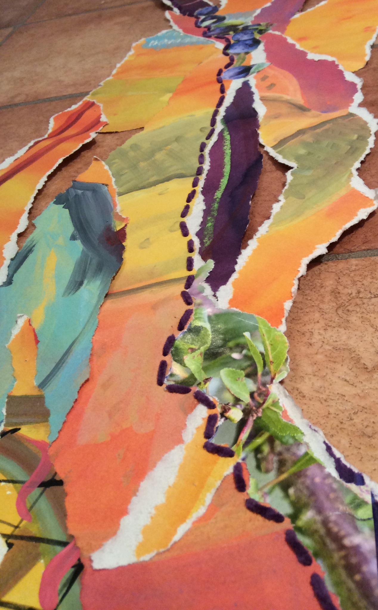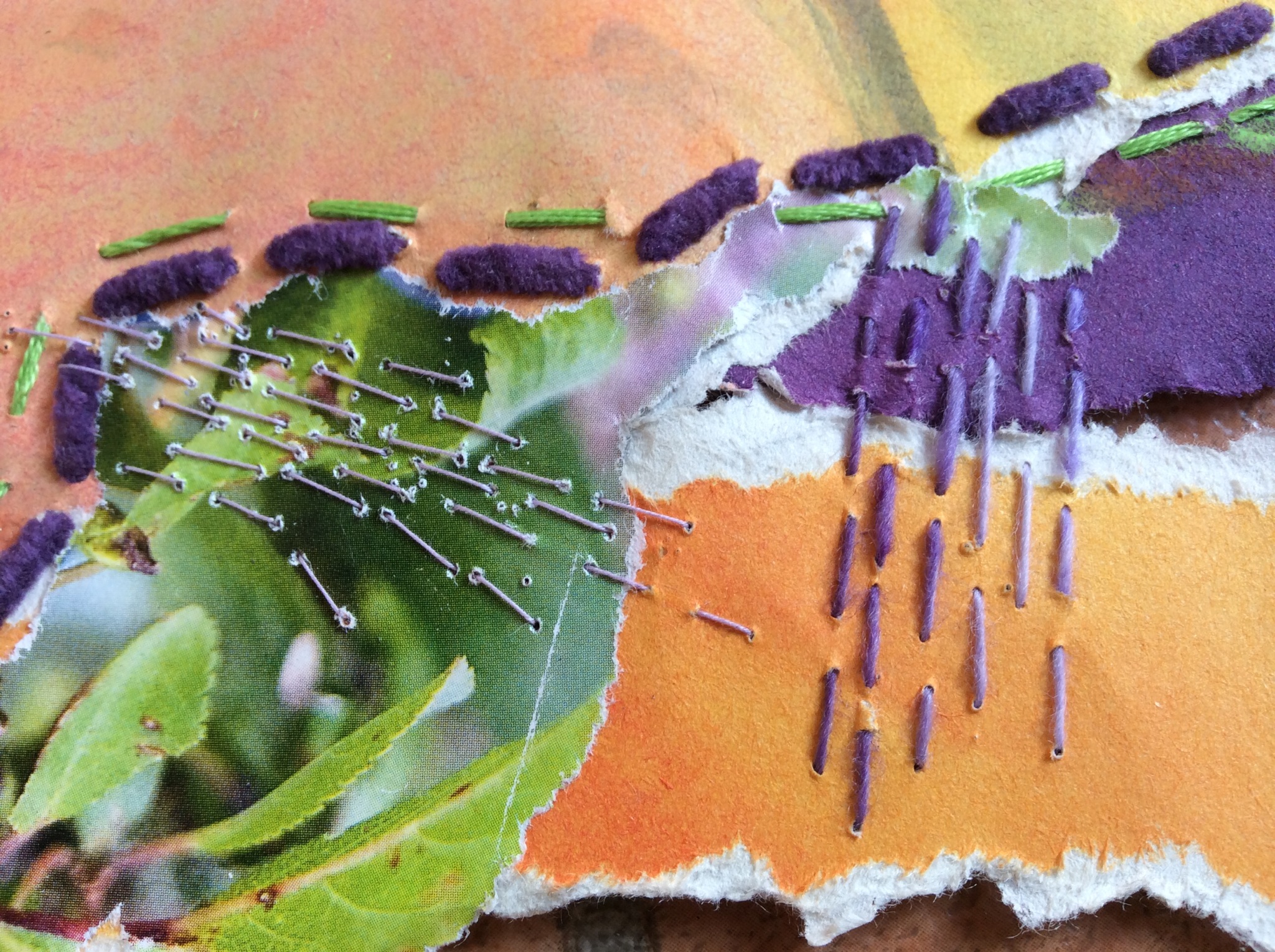 I wanted the purple to be more prominent but not to obliterate the colours underneath, so decided to add some small magazine pieces. These were images of berries and leaves and I had to take one piece off and rearrange some others so that the image itself wasn’t the focus. This may have been a bit of a mistake, but it did spur me on with some new patches to respond to. Hand stitching is certainly hard work and takes discipline, especially for me as I recognise I like to work quickly, but ‘slow work’ is probably something we could all do with engaging in more. It’s textile mindfulness.