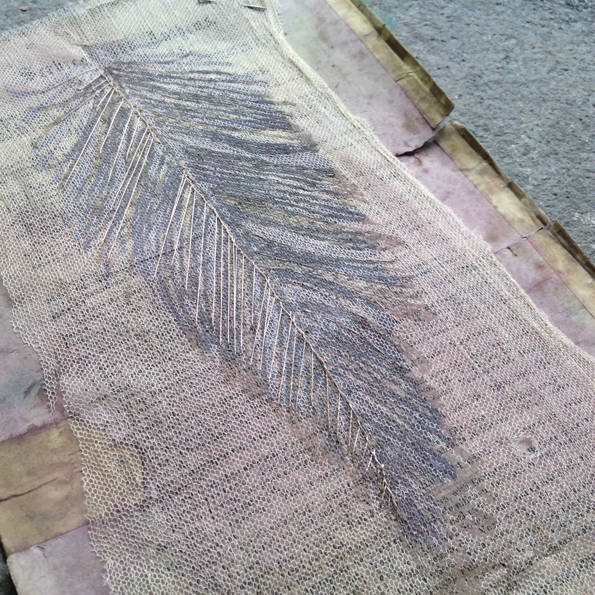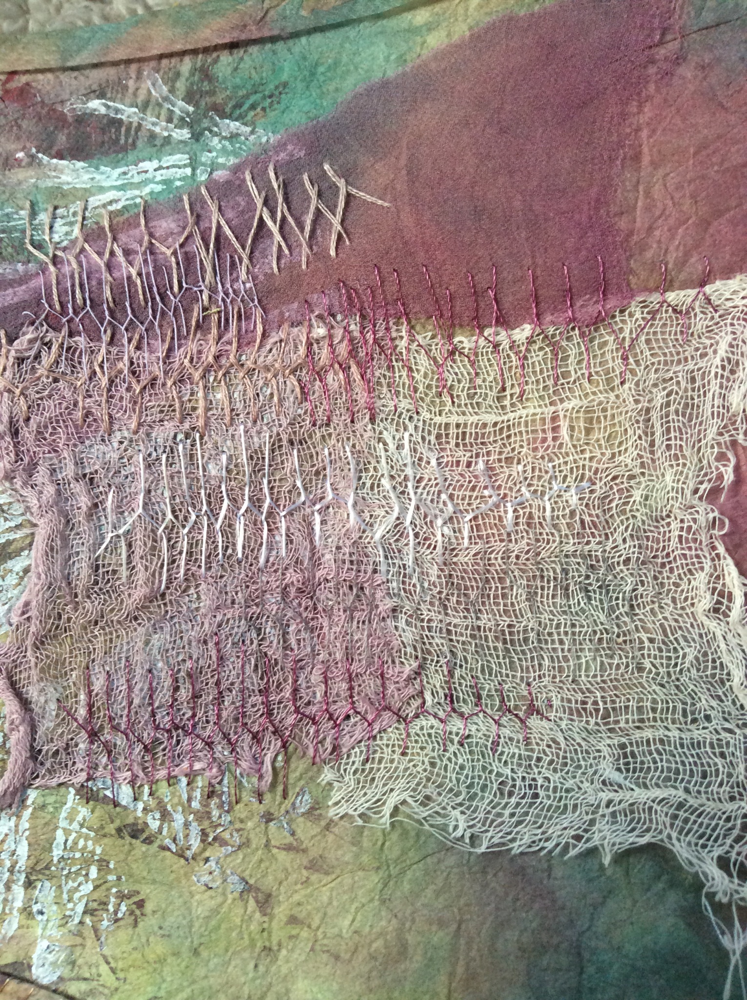 This one was done using some roller prints on Procion washed paper, then scrunched tissue paper was sewn onto the figure which was also printed with a string print block. It was torn away on the stitch line with further machine stitching.