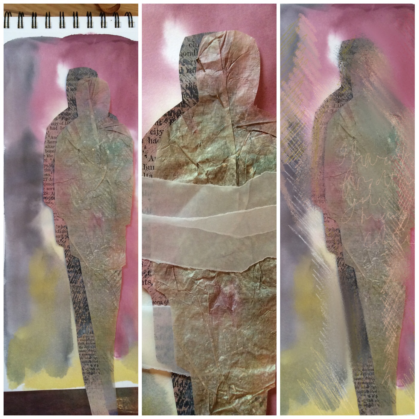 I want to do something about wings and found that I could use bits of papers and fabric to suggest wings within the figure.