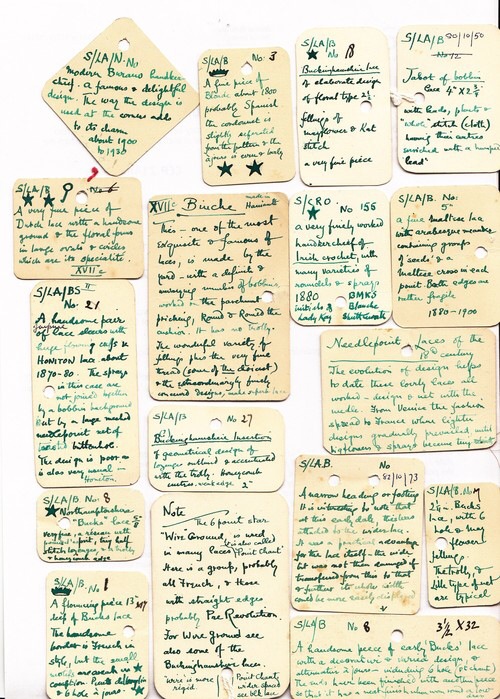 Her amazing notes with a system of symbols detailing countries, types, and importance of pieces.