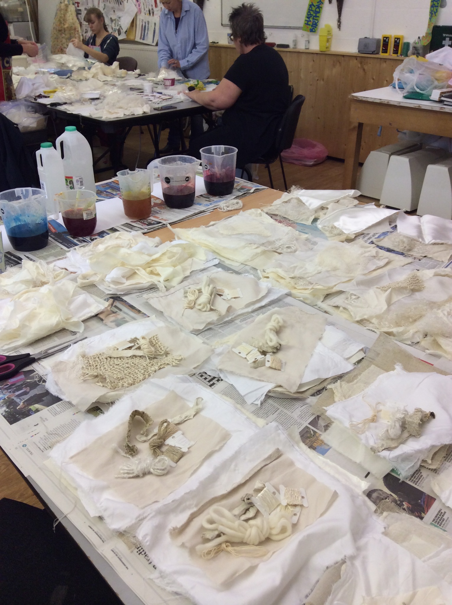As for the natural fabrics, they were placed into little piles with various threads ready to dye with Procion in plastic bags. Procion is mixed with soda and salt to fix the dye and reacts for an hour or so. Some were dyed with single colours to compare how fabrics take the dye, but I wanted to mix the colours and create more of the tones I love. The bags were kept for 24 hrs before washing out. We will then piece them for our homework. Just to say…it took three hours by the sink and I now have the muscles of a champion heavyweight, but I’m eagerly awaiting the dried results!