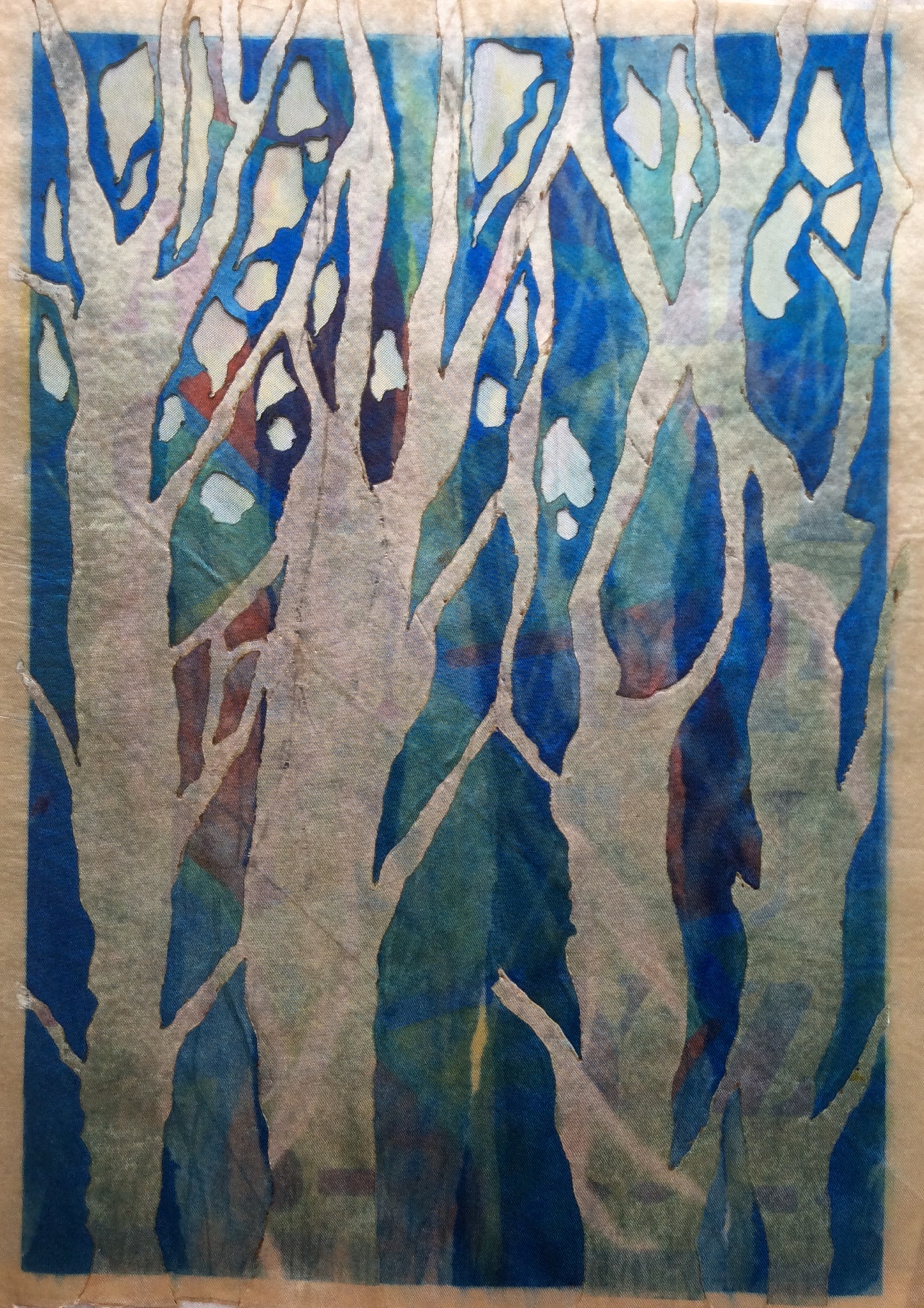 We then used soldering irons to cut more intricate shapes from the prints. They were ironed onto Bondaweb first. Careful pressure enables you to cut through the fabric and leave the back paper on so little bits can be peeled away and replaced onto other work. This is highly addictive and I’ve come home with an iron to play with over Christmas 🙂 Most of the resists will become something different as they are layered up and stitched.