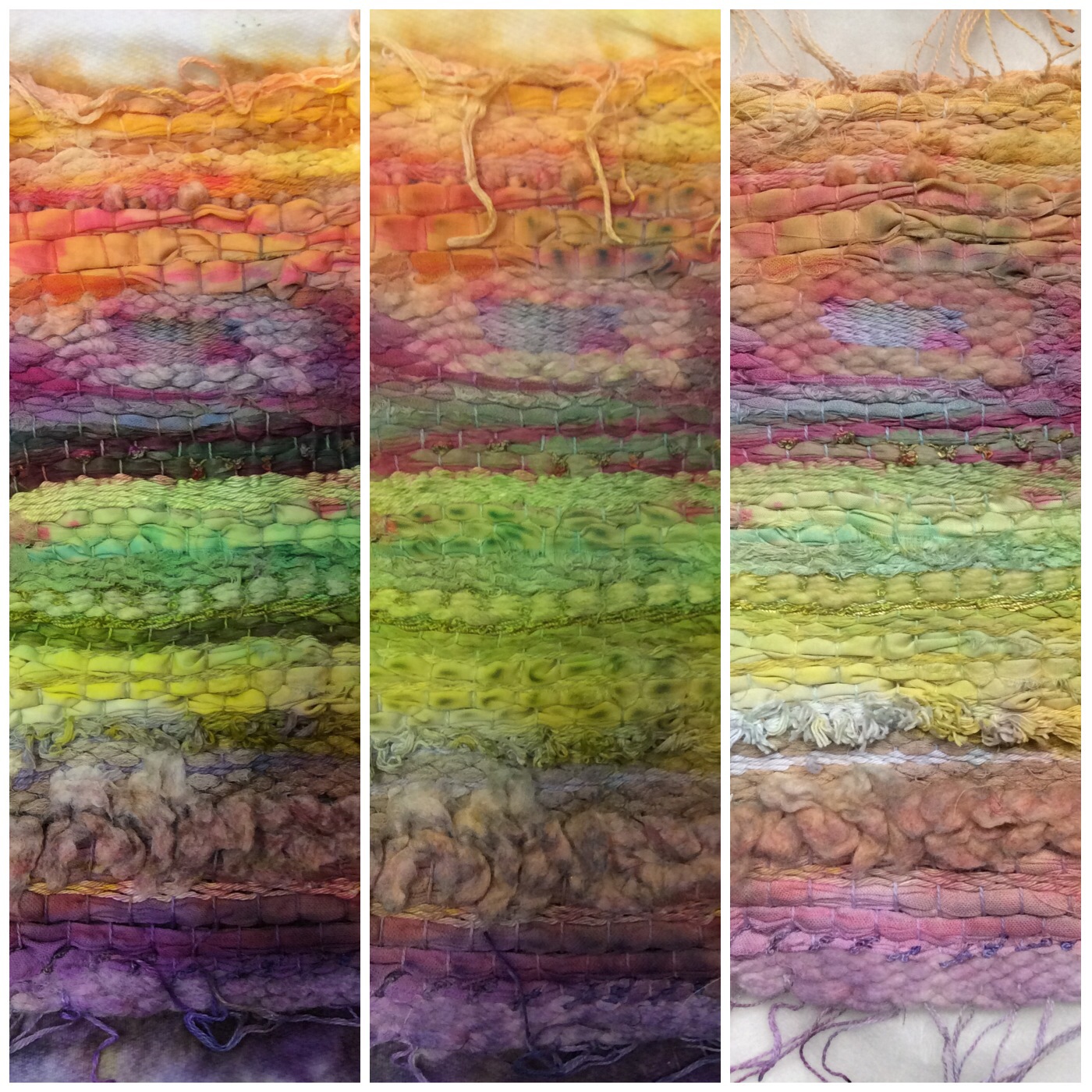Finally. Having decided that I really hate weaving, I took along a small piece that could be dyed. It had all sorts of fabric and threads in it. Here is its story. From left to right – fresh and wet, damp and blotchy, and rinsed and almost dry. I may even have to tell Kim that I slightly love it a bit and may allow it a bit of stitching…who knew?