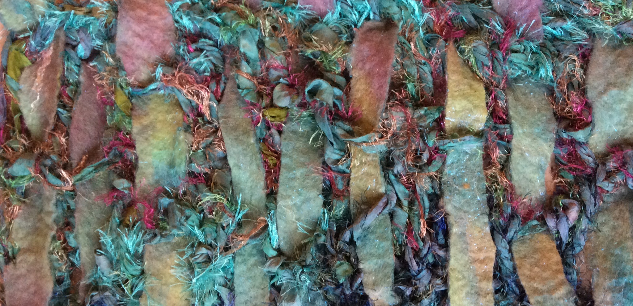 Risk two was sewing organza into it and having some of the hairy yarn and bumpy surface die back. At this point I cut slits in the organza so the yarns could come through in a small concerned moment. Risk three was sewing anything into it at all because I loved the colours anyway and I knew that in committing to this step, it would take a long time to cover it in stitch. In any case, what stitches would I do? Risk four came in presenting it back to the group with the suggestion from our Wise One that lots more stitch was in order!