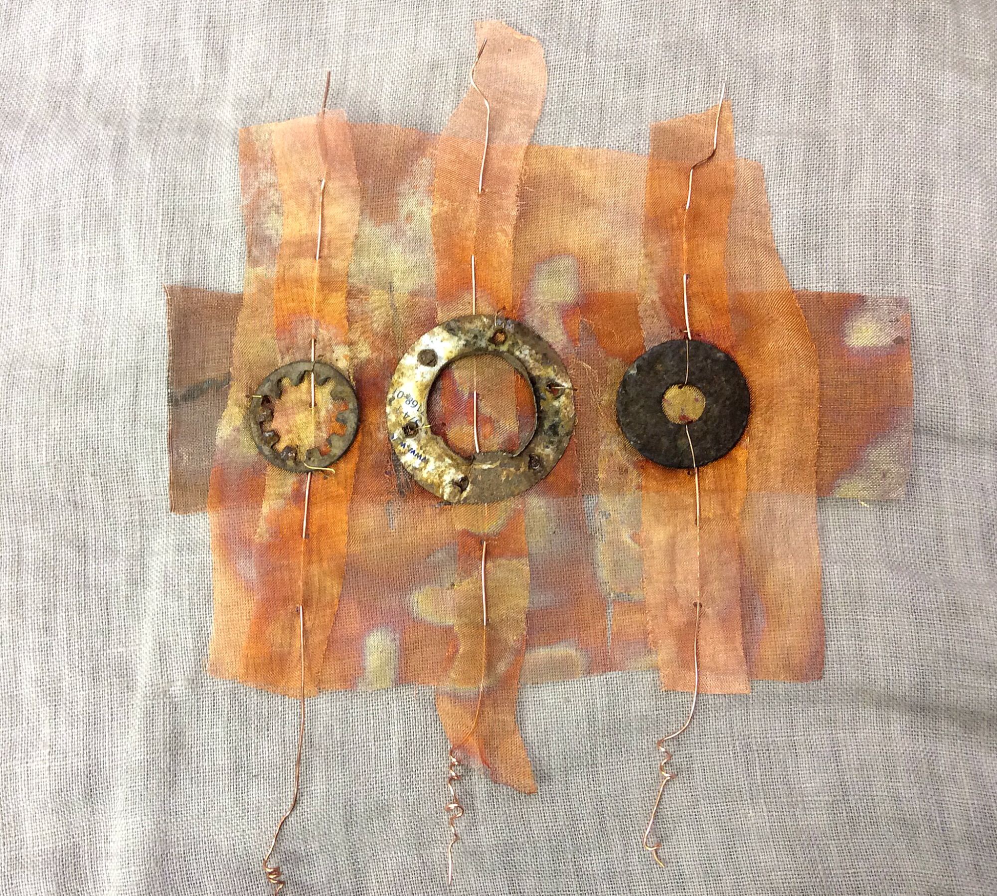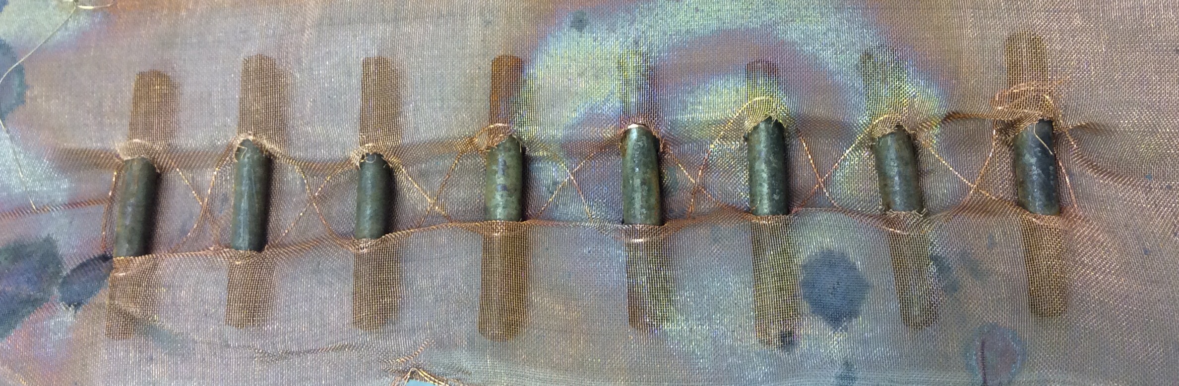 Last weekend we had more of an open session using heat. We spent time experimenting with metal shims and foils, but the type I liked best was the thin metal mesh sometimes called woven cloth. Steel and brass don’t discolour well with the heat guns, but copper does it wonderfully! I had a go at resisting the heat with washers etc. to see if patterns would be made but it was rather indiscriminate. It didn’t really matter! Just using the heat gun in specific areas worked best – being careful to hold everything away from fingers.
