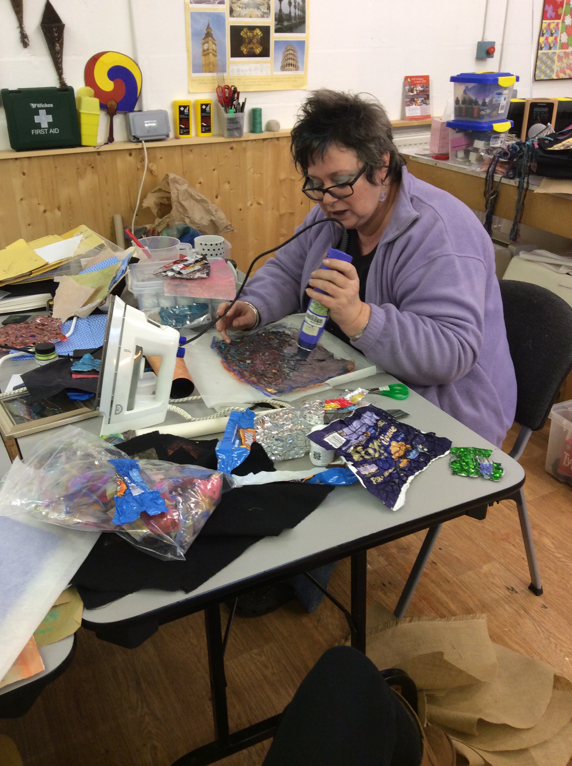 Sunday was all about Bondaweb, foils and Tyvek. We had painted up the Bondaweb, and after a demonstration from The Wise One, we all spent time seeing what could be done. The glittery bits caused some slight dribbling from certain members of the group. For someone who doesn’t really do shiny, I have to admit to a few moments of guilty pleasure!