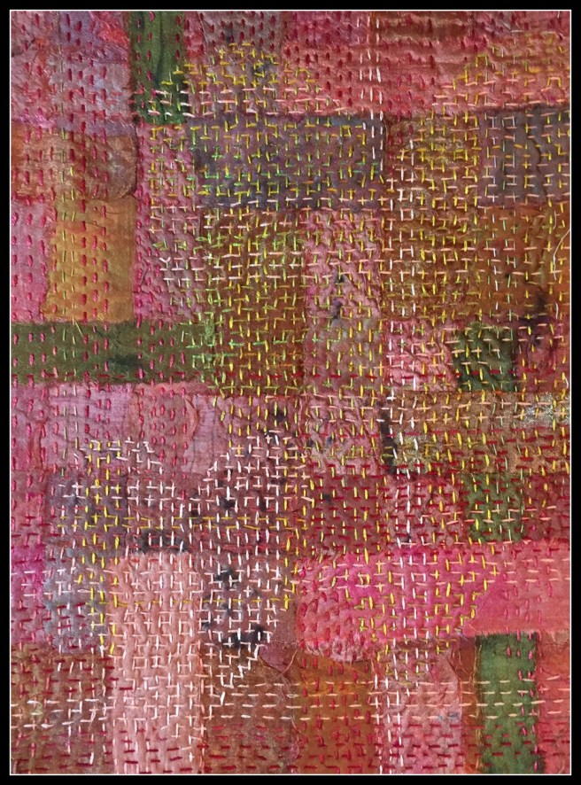 I haven’t stitched horizontally and vertically everywhere.  There are patches of one or the other, and one or two little gaps around the shapes which provide a bit of interest on inspection.  This kind of stitching is something I explored this year and just enjoy whilst sitting in an evening.  It’s very soothing and allows texture and colour to build slowly.