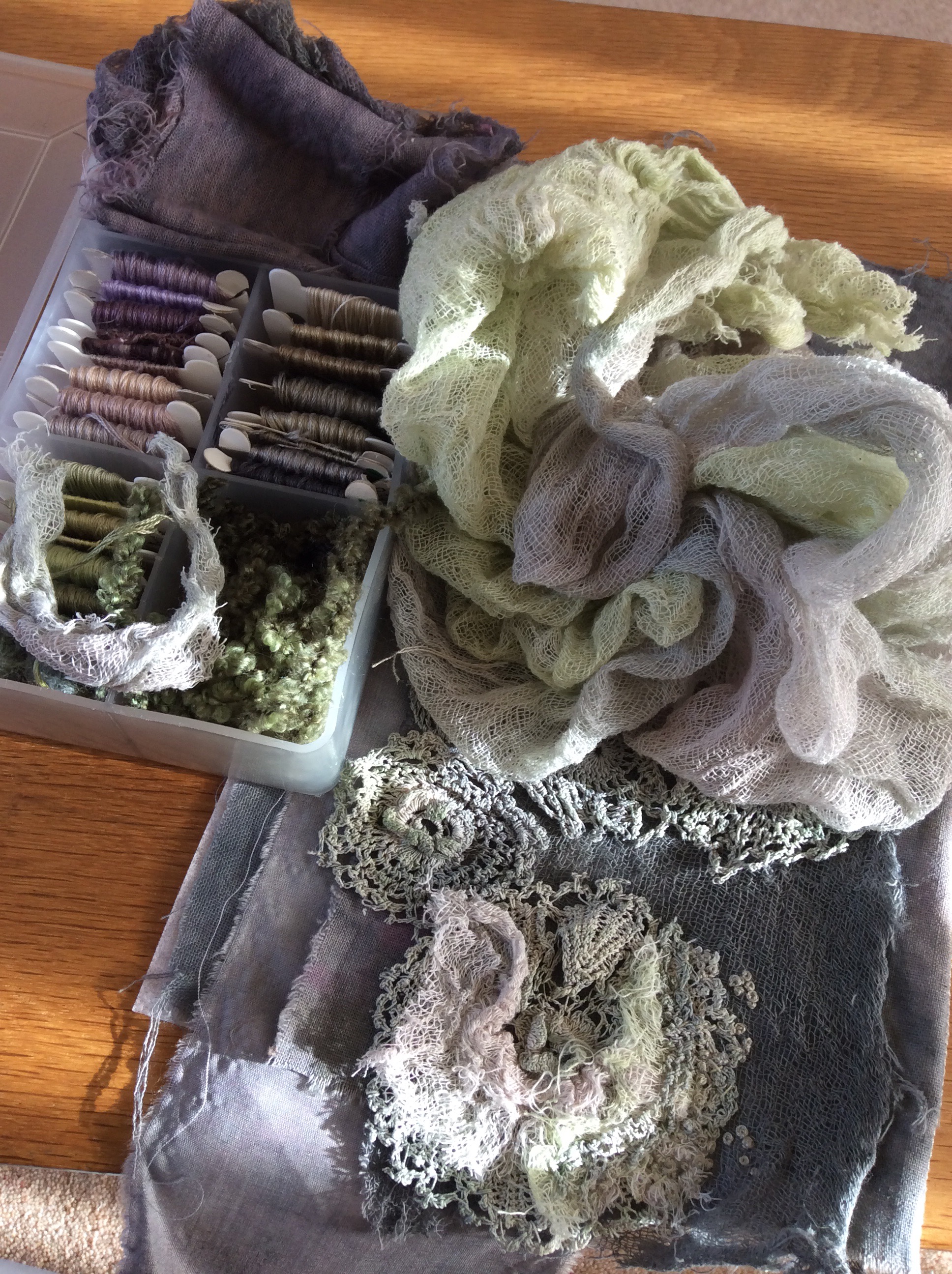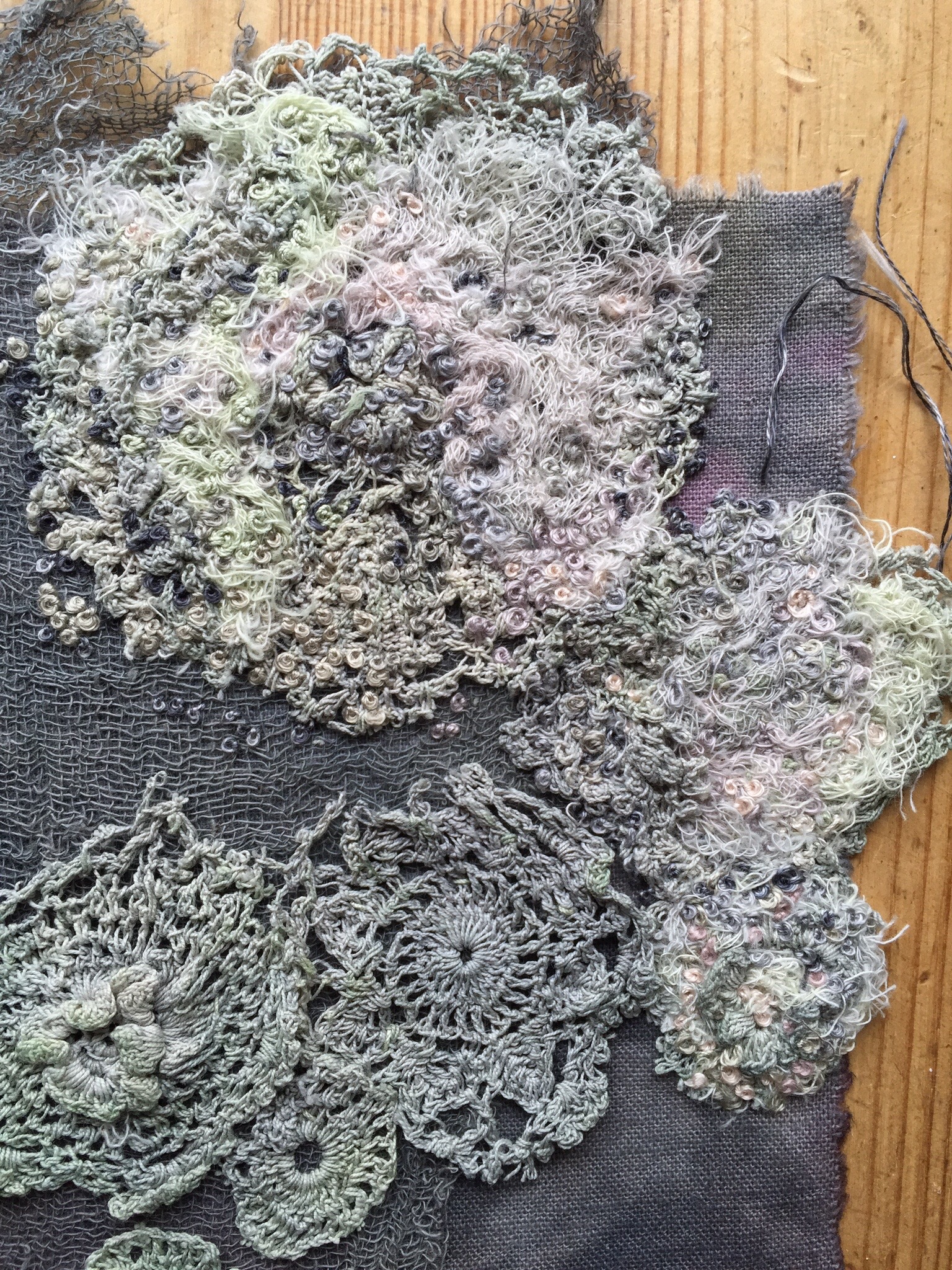 Anyway, on setting eyes upon some bits of dyed fabric and an old crocheted thingy, I thought they might be transformed into something ‘licheny’.   I am in the middle of a bit of something, and boosted by the lack of surprised looks or comments that what I was doing looked ‘interesting’ at our guild yesterday, I’m prepared to show you what could be the start of something exploring these treasures.  I’m already thinking transfer printing and soldering irons for the frilly ones… I’m sure this is nothing new but what I feel is important is that it’s new for me.  Finding the ‘extrordinay in the ordinary’ is always wonderful.