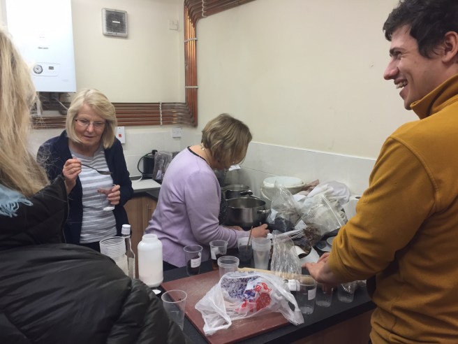 Well that’s it.  I have emptied my head and imparted my wisdom from the day.  It was good fun, and makes you think about the environmental issues etc but the biggest thrill was following a process from scratch and realising the potential of the natural world on our doorstep.  Something about creating from a basic source is deeply satisfying and personal. I know many artists are turning to natural dyes in their textile work as environmental issues increase but if I’m honest I’m not sure how much of this I can (or want) to take forward in the limited time I have to create at the moment.  Knowing how to do it now has confronted me with the question a bit more, and has certainly added to my knowledge and possibilities for using natural dye.