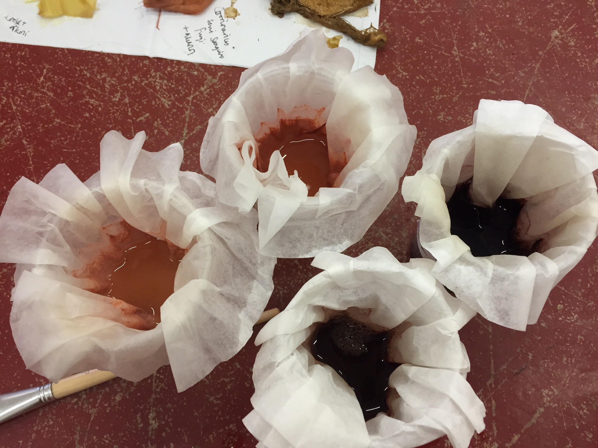 Now, as if that wasn’t enough, we then moved into making pigments and paint.  St James had the better of us by now, so he explained that pigment was just something solid that you dye.  Got it.  So we chucked some chalk or gypsum into the dye and filtered it through coffee filter papers.  As if by magic, chalky pigmenty stuff started to form.  But one more lesson was to be had.  Deep, deep in the recess of my mind, when James said you could use an acid and alkali to make a solid, something went ‘You have heard this before in a grim chemistry lesson when you were fifteen’.