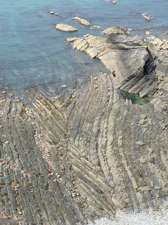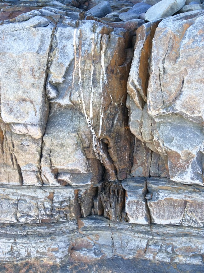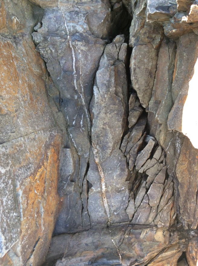 I got interested in a small patch of rock containing long horizontal undulating lines, crisp shattered areas and patches containing white quartz veins.  This became the source of many visits and about a million photos.  I have since discovered that rocks can trick you – they are not always the colours they seem on the surface.  Broken pebbles have revealed some interesting facts.