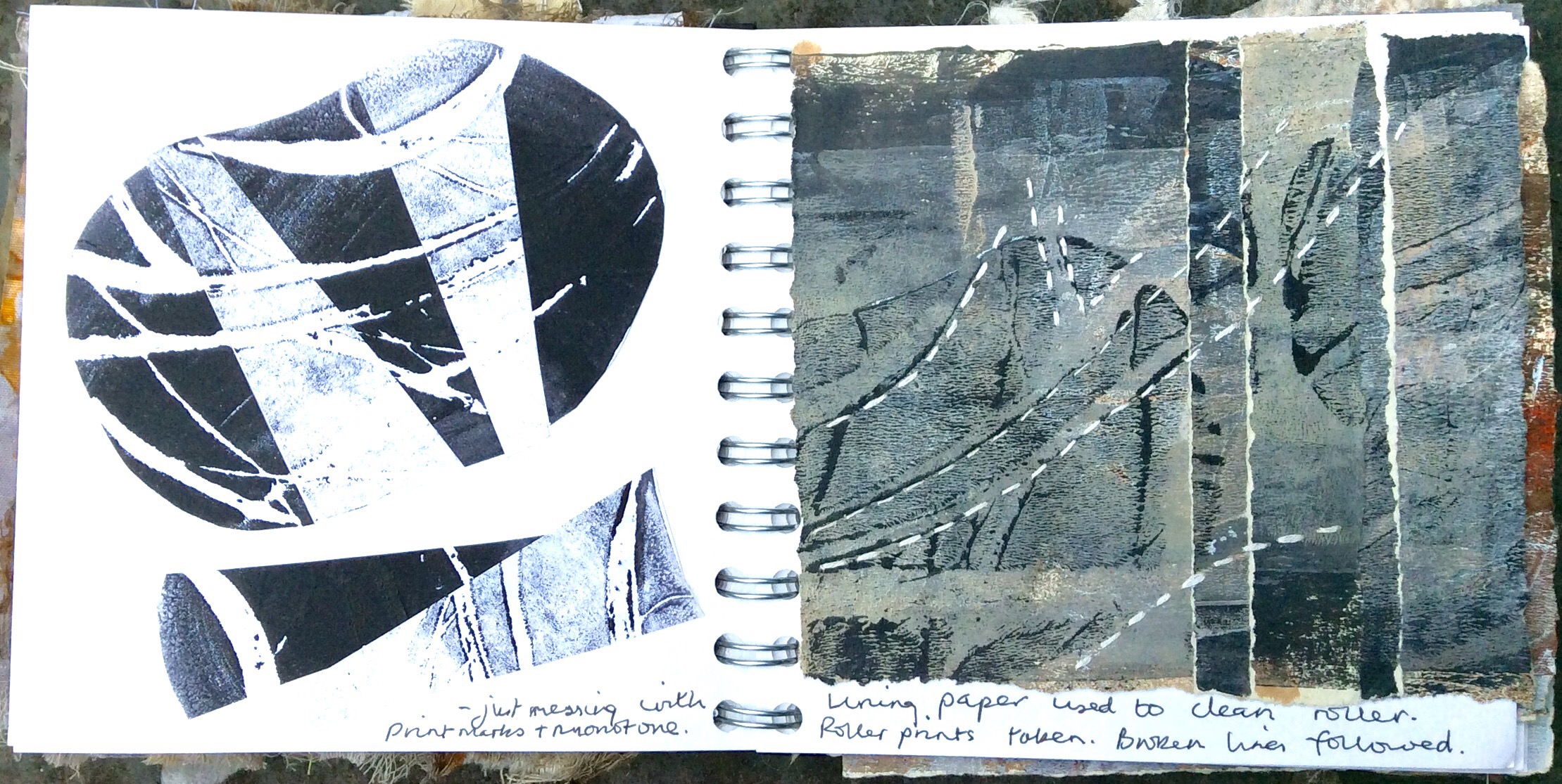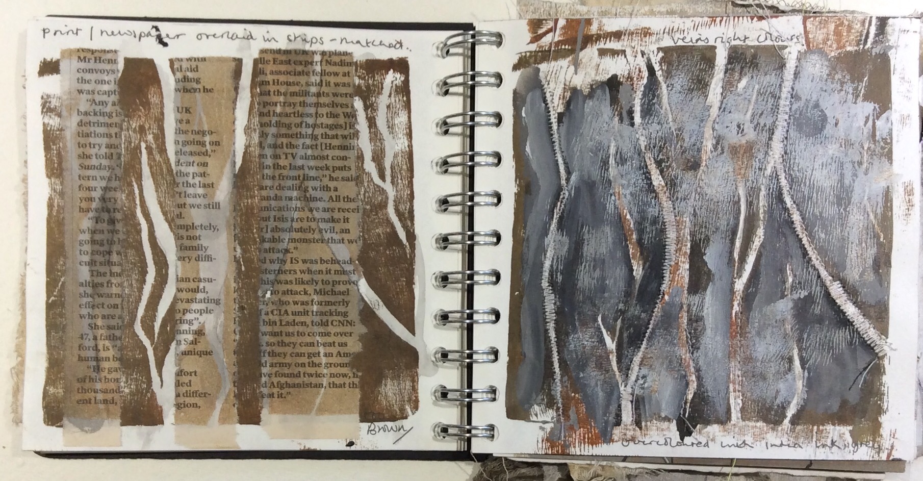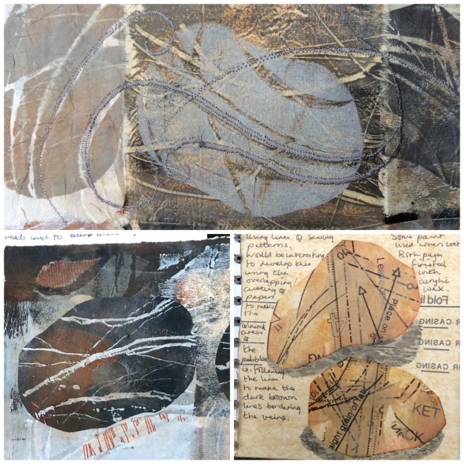 Like lots of others, I really enjoy looking through the sketchbooks of other people, but if I’m honest I have always felt impeded by the need to have mine somehow look ‘good’. Maybe this is normal but it’s silly really as it isn’t the purpose.  Nonetheless, I do feel many of us struggle with this especially if we are likely to share our books.  Perhaps the main thing is to decide what you want it to be, from the book that is a piece of art itself to the place in which to mess and muddle.  Even that’s not easy!   I feel I have developed the things I like to work with so my new little book does give me pleasure to look at, and it does look vaguley like my perception of a ‘proper’ sketchbook, but more importantly it now contains a memory and a personal process that is reaI.  I still struggle with tearing out the ‘bad’ pages and having it look a certain way, but I’m getting better slowly. (Yes, I have only shown you certain pages, so I’m not healed yet!).  I don’t know if any of this will be developed into a resolved ‘something’ – I do have a few design ideas but I can honestly say I did what I set out to do which became playing ‘rock, paper, scissors’.