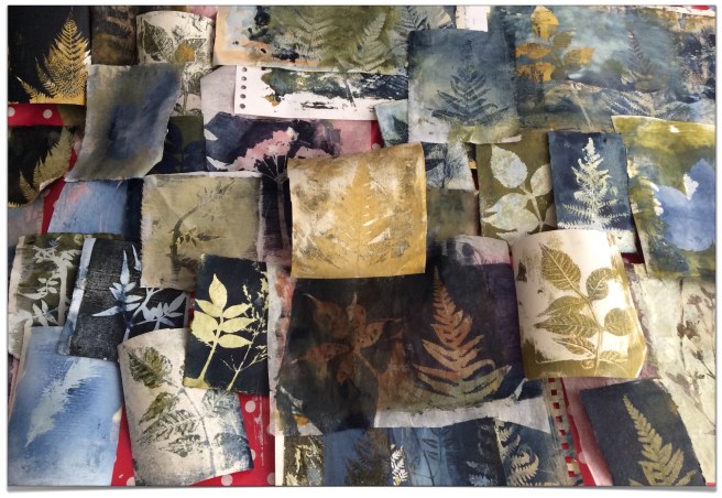 Finally, after twelve days of doing all this and suddenly thinking I can’t look at another rock again, I packed everything away then felt lost without something to do so I got it all out again printed a huge pile of wild plants to make into cards or canvases.  Olive green, yellow ochre, black and indigo ruled.