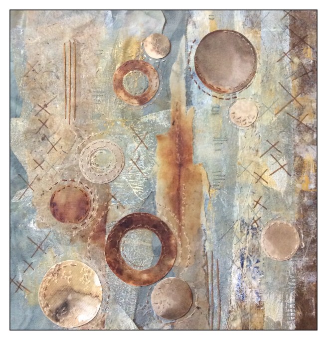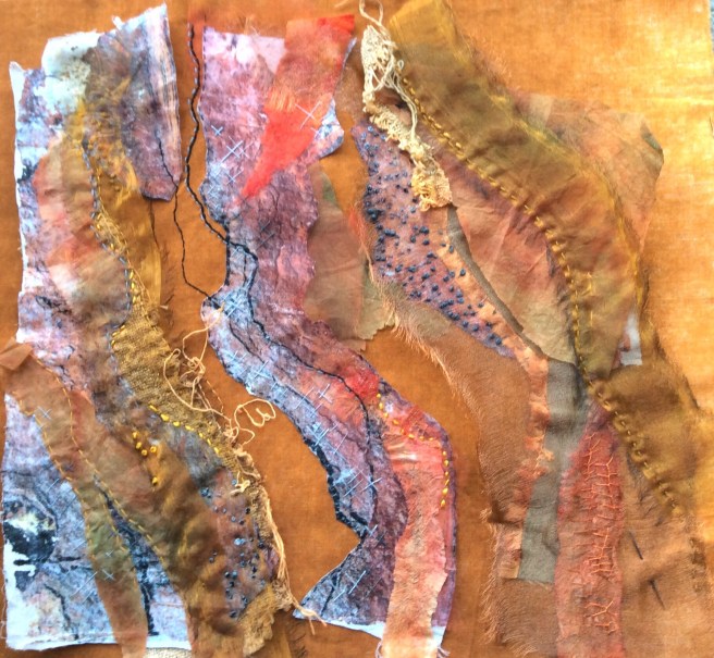 In amongst this is a gel transfer print of some rust at Filey beach. It has been cut up and combined with fabric and paper. I’m starting to find lines of interest and add texture. The different combinations, thicknesses and areas of stitch are interesting to handle.
