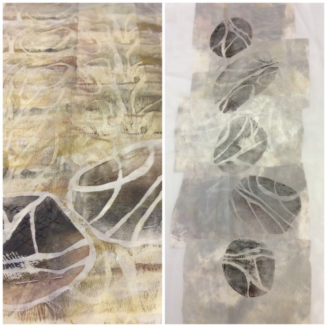 I have more printed organza for pebble work, and have been plotting some more ideas. Just auditioning some pebble prints in the images below, not quite sure about them. I did think that after playing with this theme for so long, I’d be done with it but there’s a bit more to come out yet. I think I may move away from block prints but the original theme was ‘line’ which I’d like to retain.