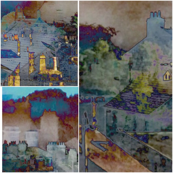 Layering the roof tops with the ‘difference’ filter creates these odd colours and isolating small areas suggests some possible designs.  If you work from a photo that is in your photo stream as opposed to your camera roll where it offers you a ‘duplicate and edit’ choice, you never lose your original by accident. But the apps are all pretty good and despite saving an edit, if you go back in to the app you can usually undo any changes.