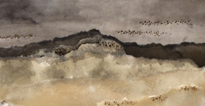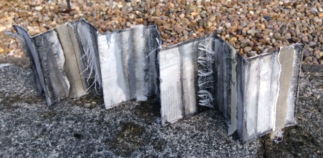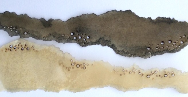 I had waxed the strips of paper and did wonder if burning holes would work or whether I’d set the cottage on fire as they turned into great balls of fire. Happily, not. One heat tool on the back doorstep gently singeing away in the afternoon – very nice.  Just playing around now to see how to progress things and how best to show off the holes.