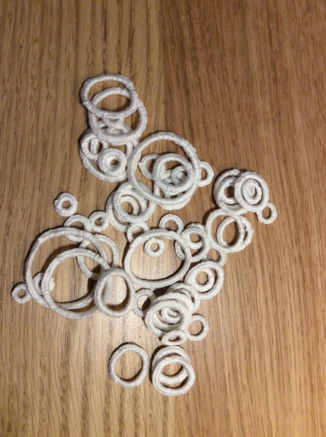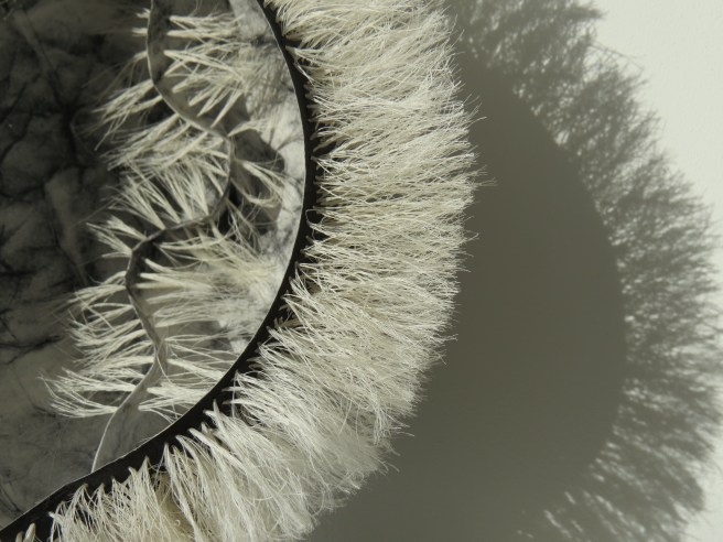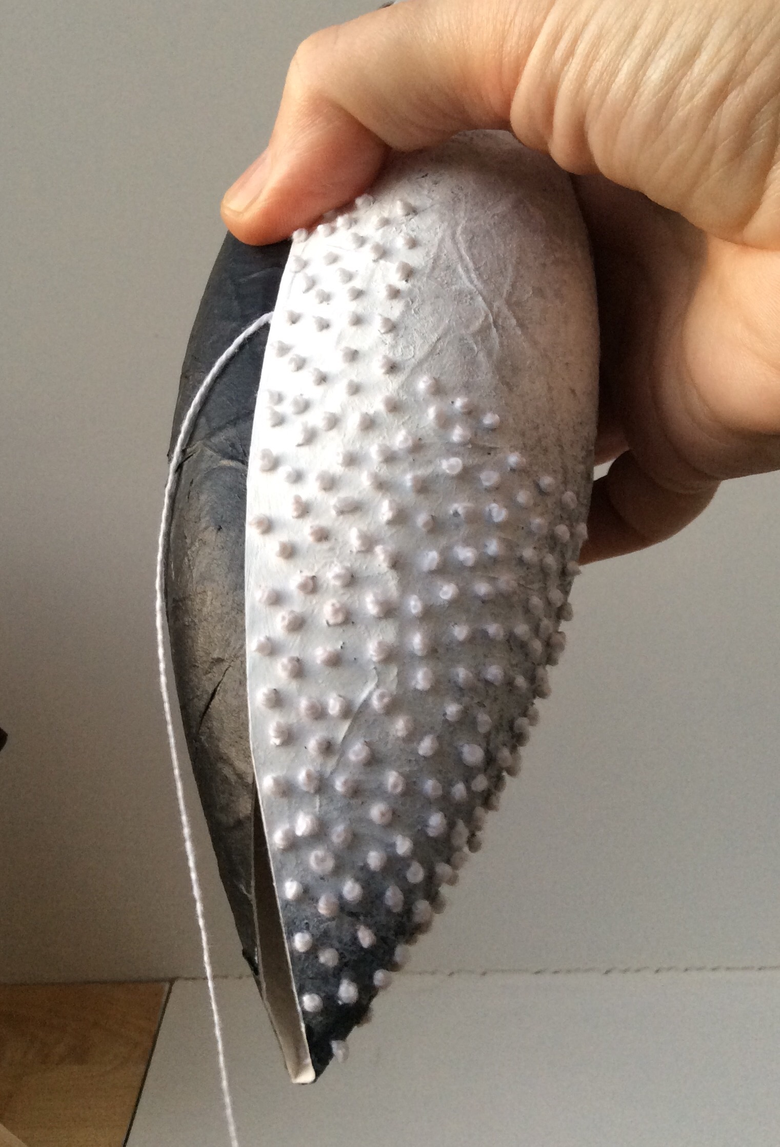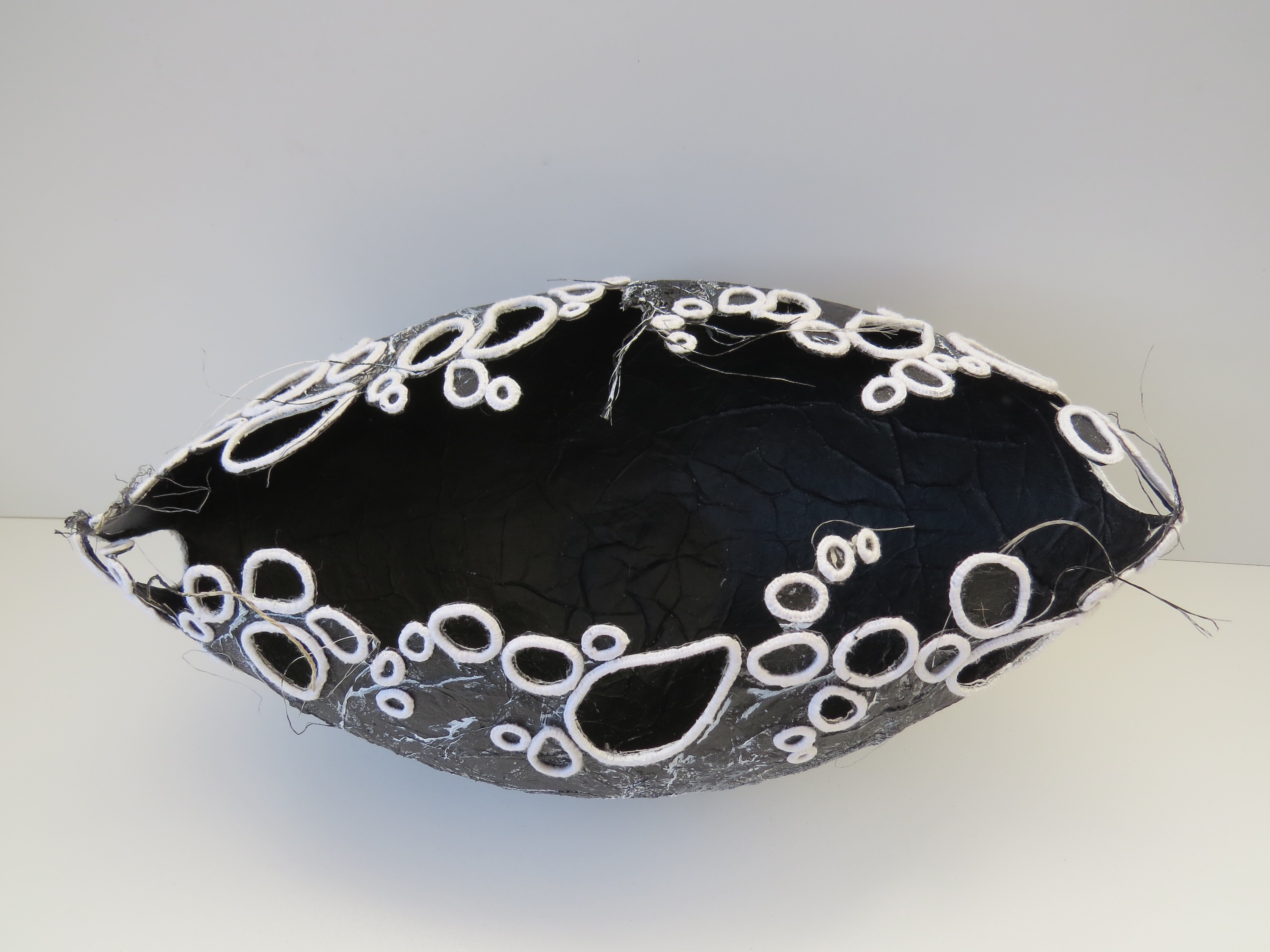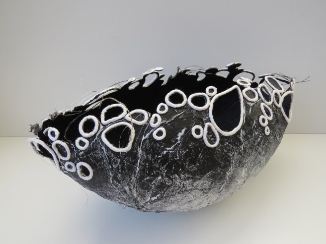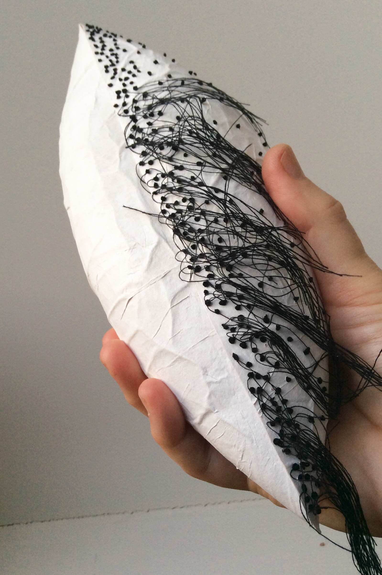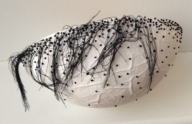 I have recently finished another one which sits rather than hangs. This one took a long time as the large button hole rings can take up to half an hour to make. The body is made from the usual base of teabag paper and cmc paste, and this one has been covered in scrim and then over-painted to emphasise the ridges. The rings were glued around the top in a way I hope makes the eye travel, and some have been cut out in the centres so you can see through. The pods can all be reshaped in the making by spritzing them with water and re-inserting a balloon back in and leaving to dry. This way, you don’t have to worry if the shape changes with stitching, unless you like what’s happening.