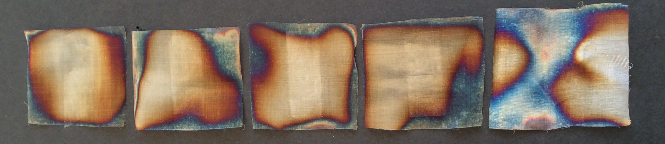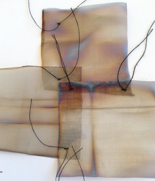 I recently helped organise a workshop which Alysn Midgelow-Marsden led for our group, and spent a weekend sewing into metal. She was a wonderful tutor and lovely to spend time with. Alysn was also at Knitting and Stitching and I hope you may have seen her extraordinary metal dresses and sculptures. Alysn had sourced a large amount of fine steel ‘cloth’ and I have some to play with. Burning it produces some wonderful colours and I’m wondering if I can make a kind of armoured pod of sorts which will highlight the coloured edges?  I may not show mum.  I love the colour combinations produced – they sit well with my love of muted tones. Heated copper is also impressive but I particularly like this steel.