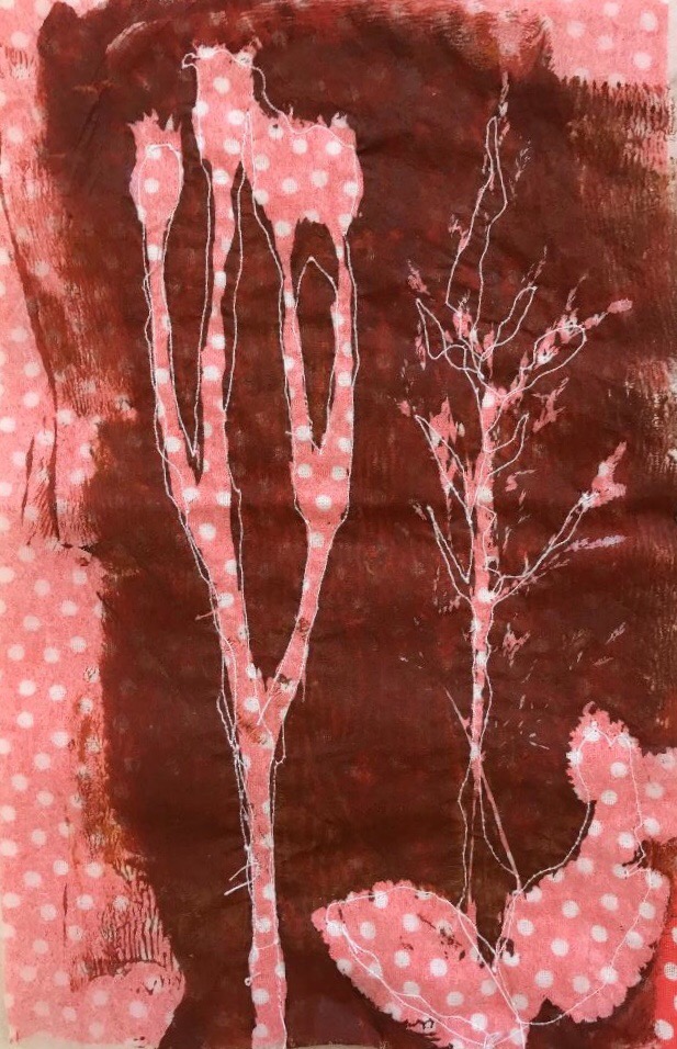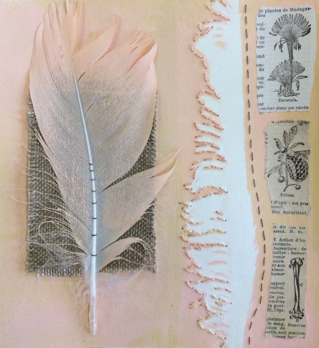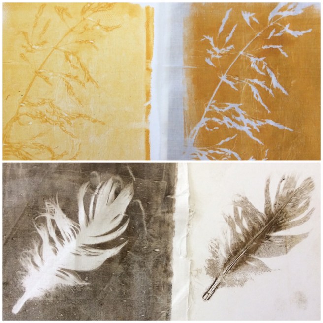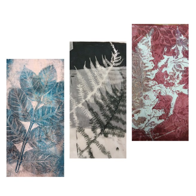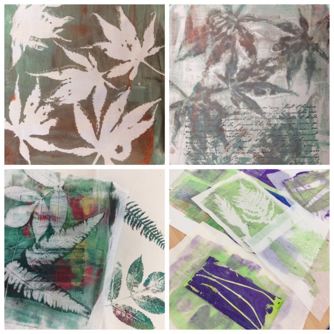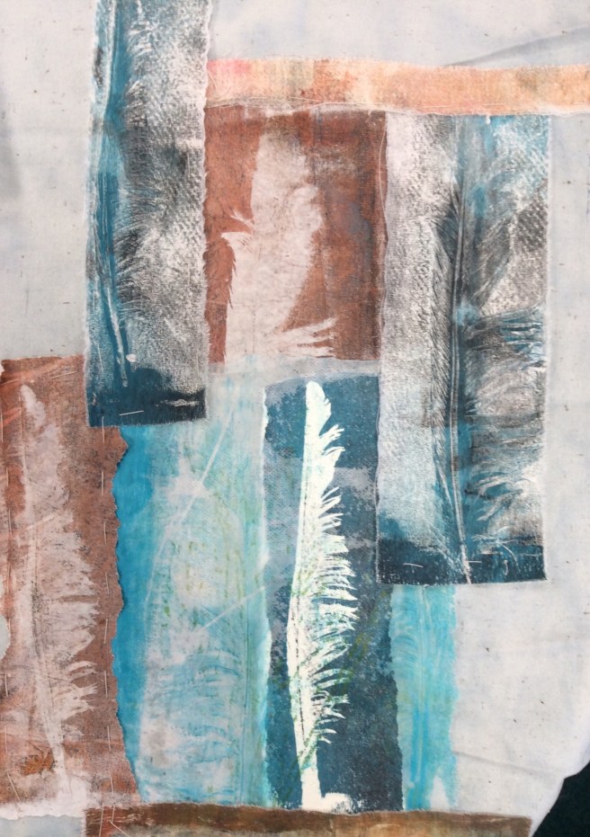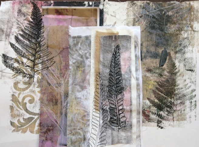 I have been celebrating the natural world with a couple of workshops and lots of lovely folk. My guild were brave enough to allow me to practice a new printing, collage and stitch day I have called ‘Natural Selection’ and I have just met folk from the Manchester ICHF show who signed up to have a play. Either arms and bags were presented with hedgerow plants and feathers or people snuck out to exercise a spot of judicious pruning at our venues. I have found that late summer is the best time of year for this, as leaves have lost a little moisture as they prepare to give back their goodness over Autumn. They make a firmer print as a result, and ferns are laden with spores on the underside which make for added texture. I just thought you might like to see some of the work. I’d really like to show it all, but here is an edited set which tells the story of the day. Thank you to everyone who came and for allowing me to post your work in progress. I am thrilled.