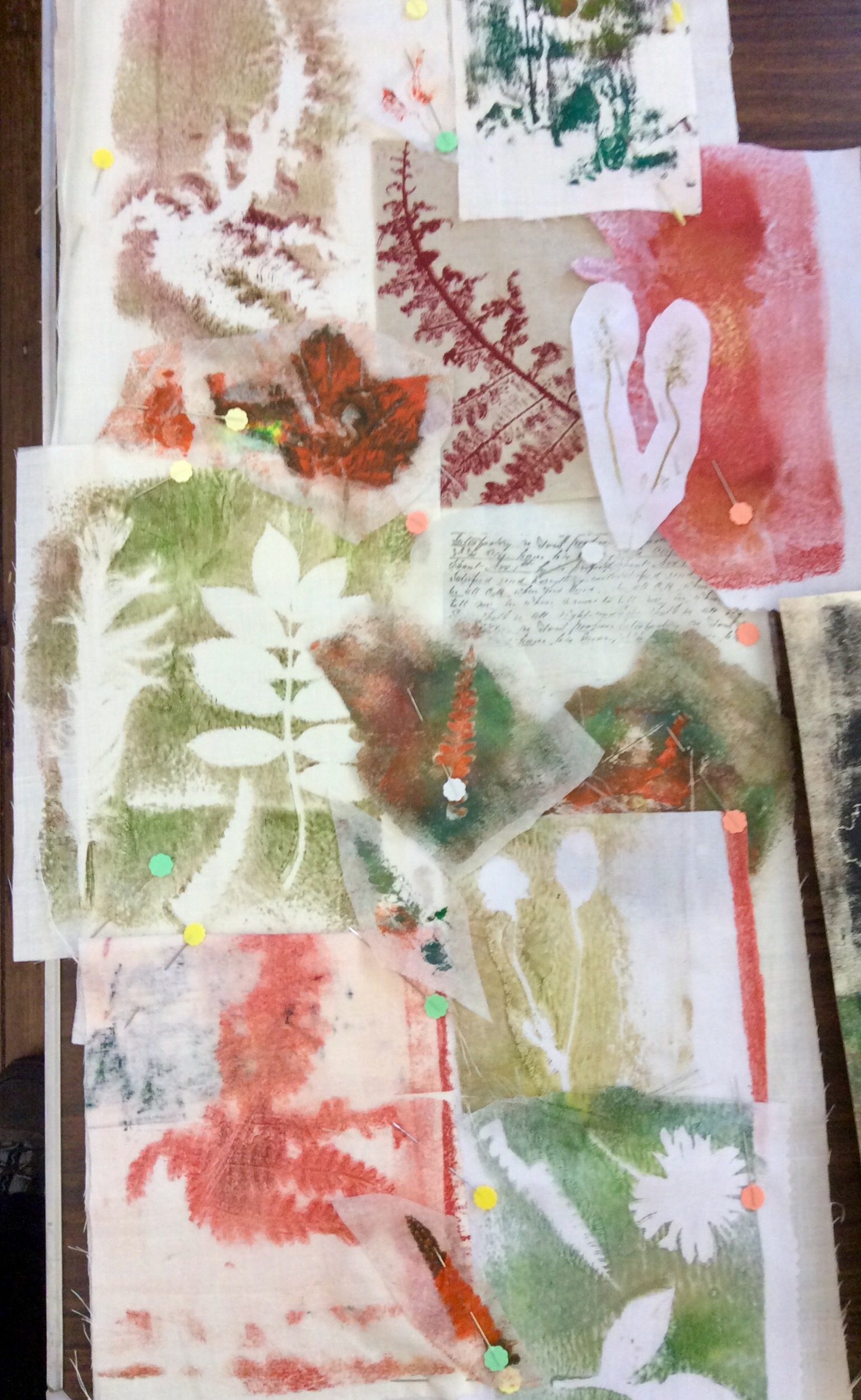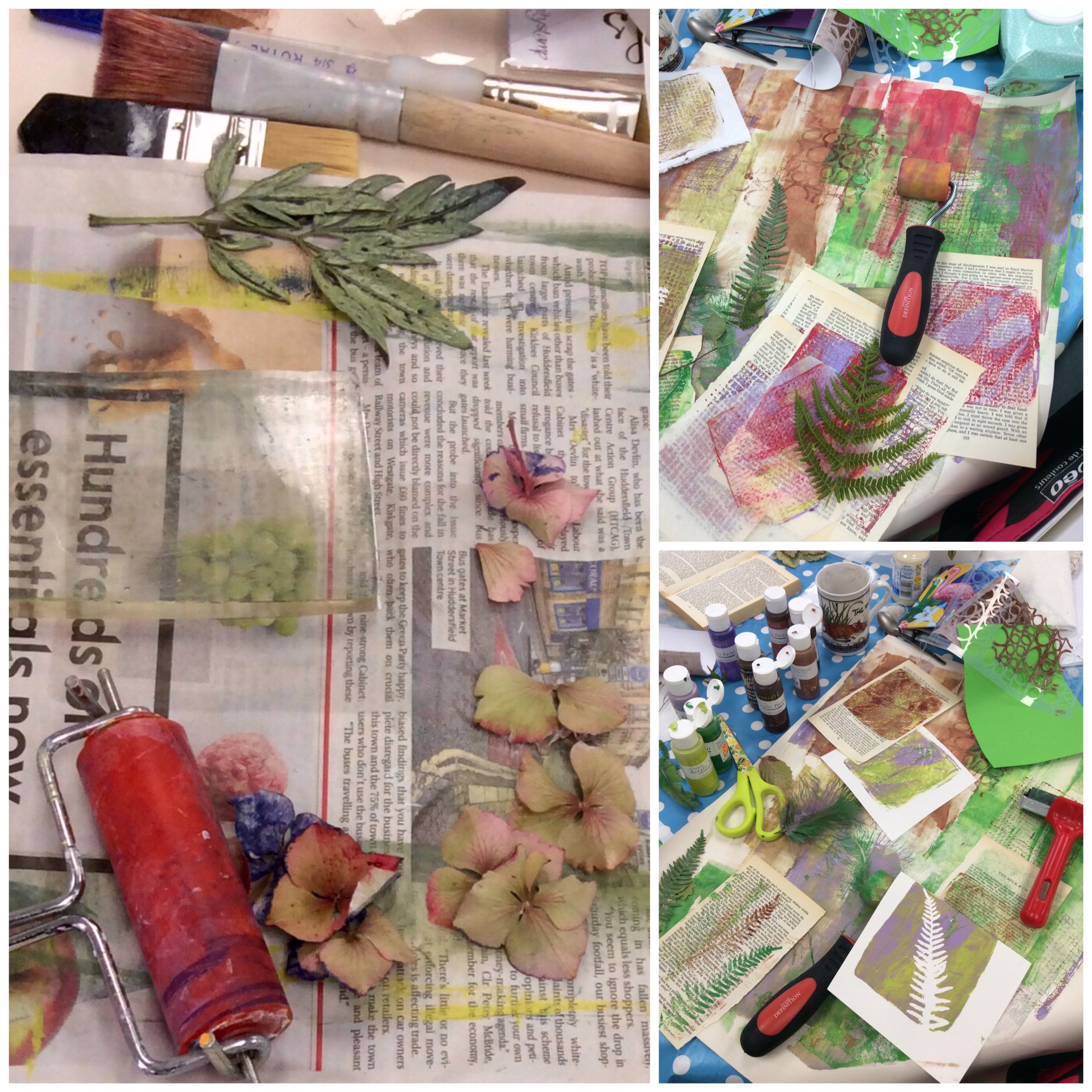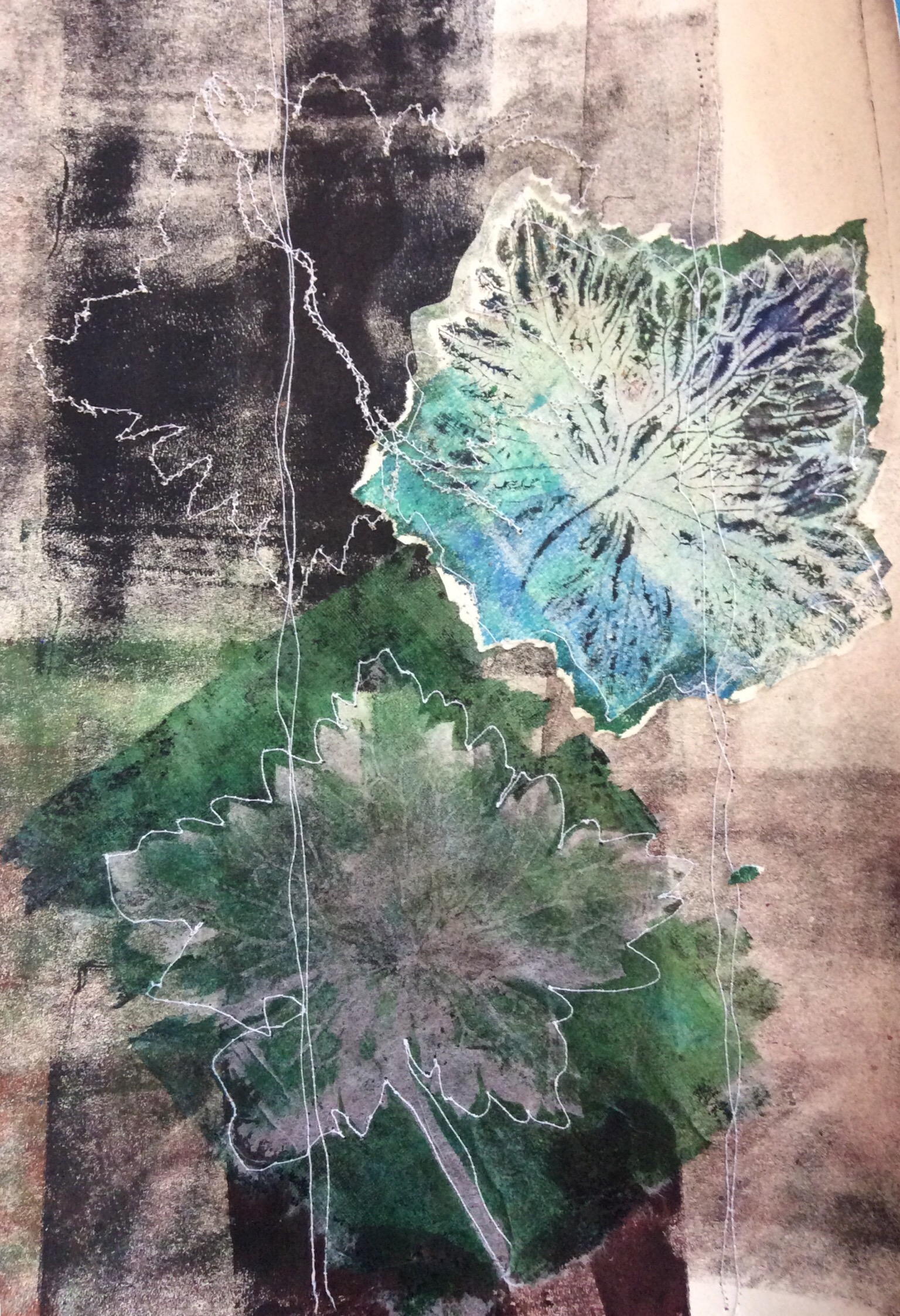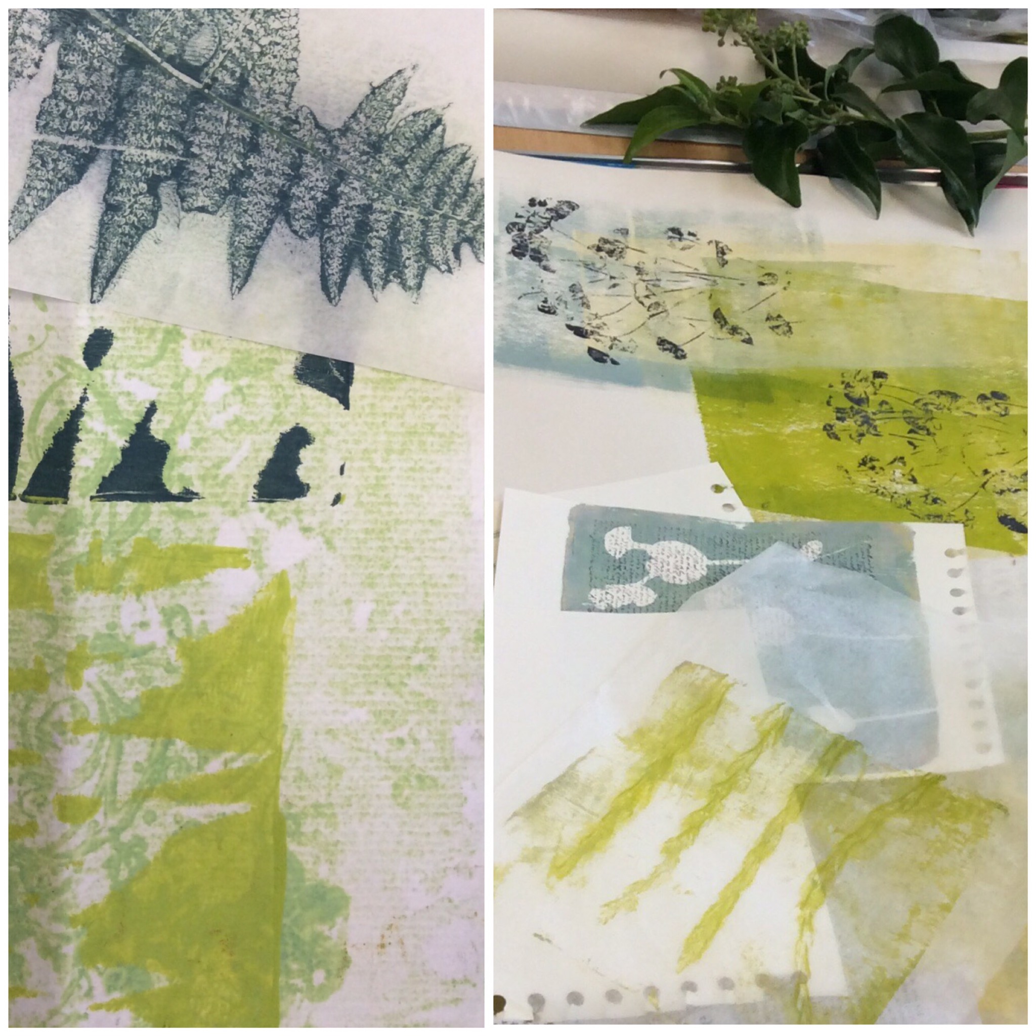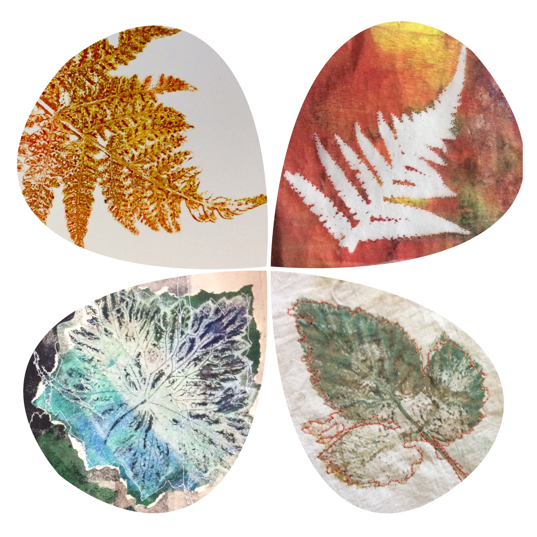 I have been celebrating the natural world with a couple of workshops and lots of lovely folk. My guild were brave enough to allow me to practice a new printing, collage and stitch day I have called ‘Natural Selection’ and I have just met folk from the Manchester ICHF show who signed up to have a play. Either arms and bags were presented with hedgerow plants and feathers or people snuck out to exercise a spot of judicious pruning at our venues. I have found that late summer is the best time of year for this, as leaves have lost a little moisture as they prepare to give back their goodness over Autumn. They make a firmer print as a result, and ferns are laden with spores on the underside which make for added texture. I just thought you might like to see some of the work. I’d really like to show it all, but here is an edited set which tells the story of the day. Thank you to everyone who came and for allowing me to post your work in progress. I am thrilled.