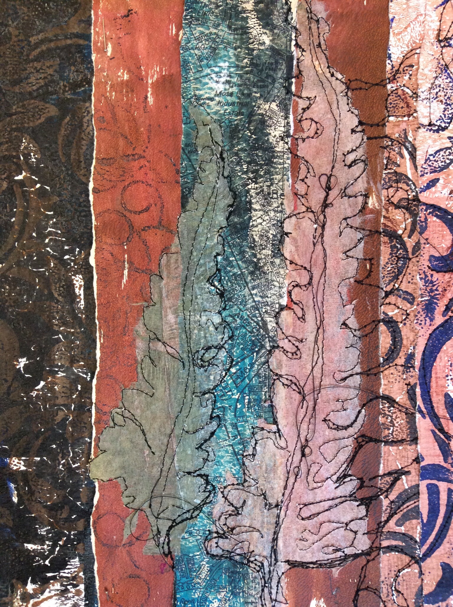 Using free machine and hand stitch from the front and back to build coherence and emphasise focal points…