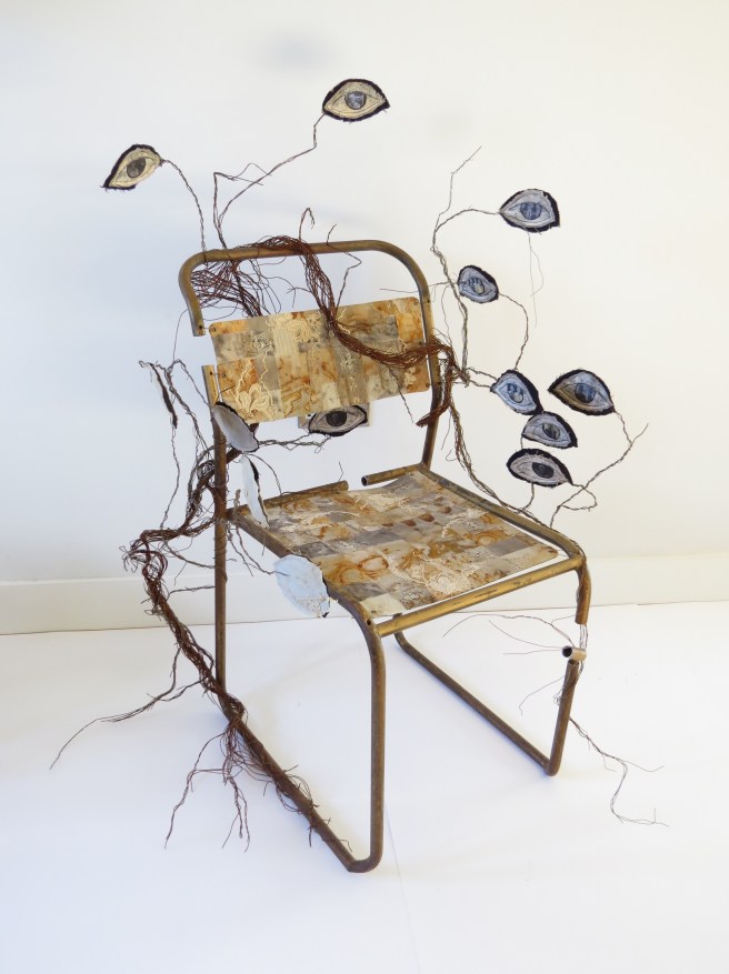 During the final phase, eyes re-emerged as a central discomforting motif, expressing experiences of being watched or held in place. Music score is employed within the construction, echoing the original function of the chair. The intrusive watchfulness of the surrounding eyes is compounded by figures visible in the pupils, made ghostly by being prints of old black and white negatives. Wire, rusted with age, entwines around the frame, encroaching and uncomfortable. Small pieces of the frame were cut away thus rendering the frame unsafe. These became less visible as other elements were added but demonstrated the tension released from the chair as the frame warped slightly over time. This serves as a useful metaphor for the healing of time and cathartic nature of creating the piece. Memory, by its nature fragmentary and insubstantial, is evoked by the pieced textile work and scraps of old, disintegrating lace. In order to visually complement the rusted, worn appearance of the chair frame, rust and tea- dyed fabrics were woven and hand stitched; the panels held in place by rusted, vulnerable wire.