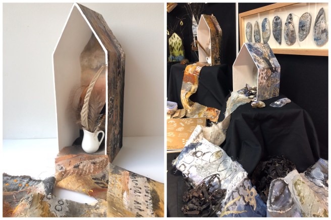 So to the show, I had a very tiring but delightful few days in Manchester talking to everyone and running workshops. The huge stone stacks provided a good backdrop to some of the smaller pieces and as I had a bit more space than anticipated, I was glad of them. The little houses holding my ‘objects of attention’ were also received well. Thank you to my friends who came along to look after things when I was teaching.