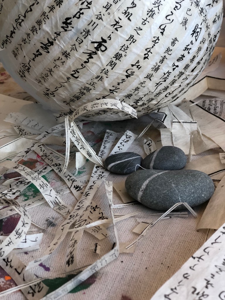 These will represent different groups or nations and will have a string tying them back to a larger stone hanging down from a shelf. I envisage them going in different directions, a few starting to turn back as if to harbour. I’m enjoying taking my time with this one. There is also a sense of returning to the shelter of familiar materials and methods, as these are built with CMC paste and teabag paper again. Other may have panic-bought loo rolls but not me: last day in the office before lockdown saw me scuttling into town for emergency balloons, PVA and gel medium!