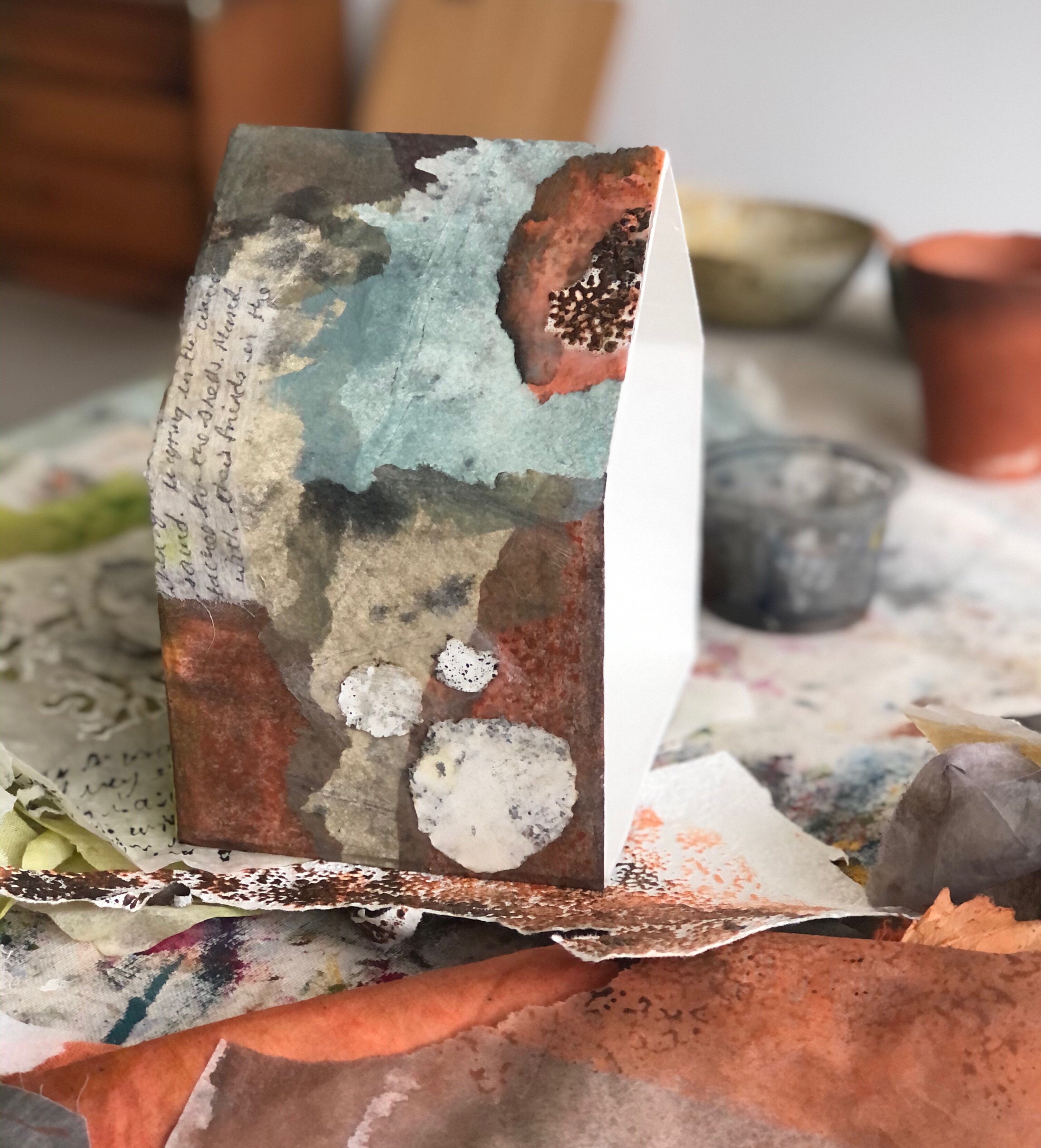 These are all being torn up and layered with other fabrics, text and papers using encaustic medium. I’m just at the start of building the surface for the house and am hoping to start on the fabric scroll this week when we have everything crossed to get away for three nights. I’m very fortunate to be working from home every day at present but I’m starting to climb our four walls!
