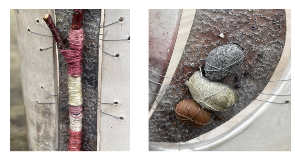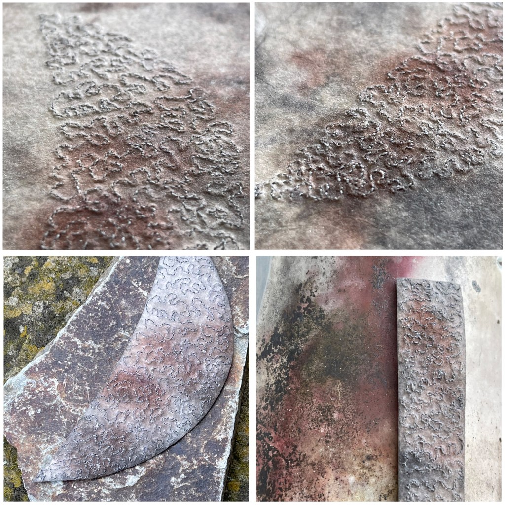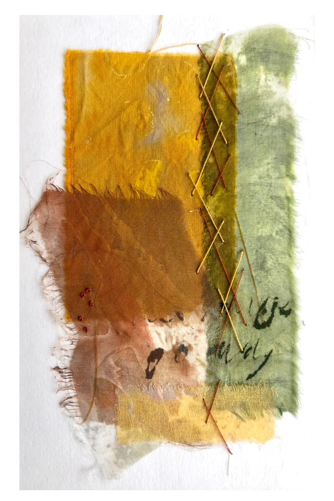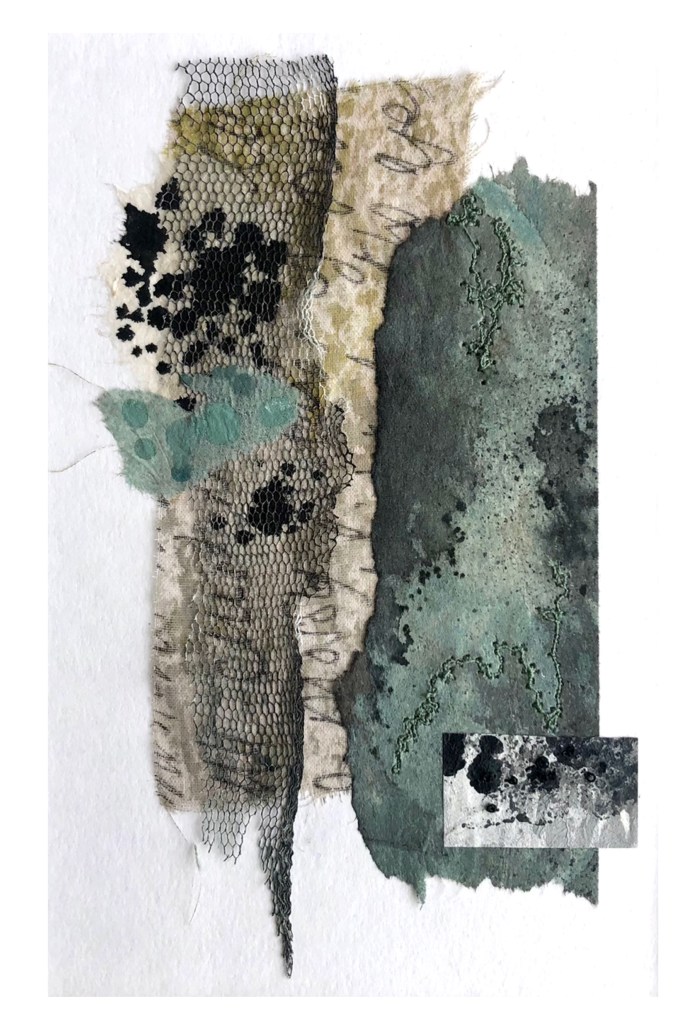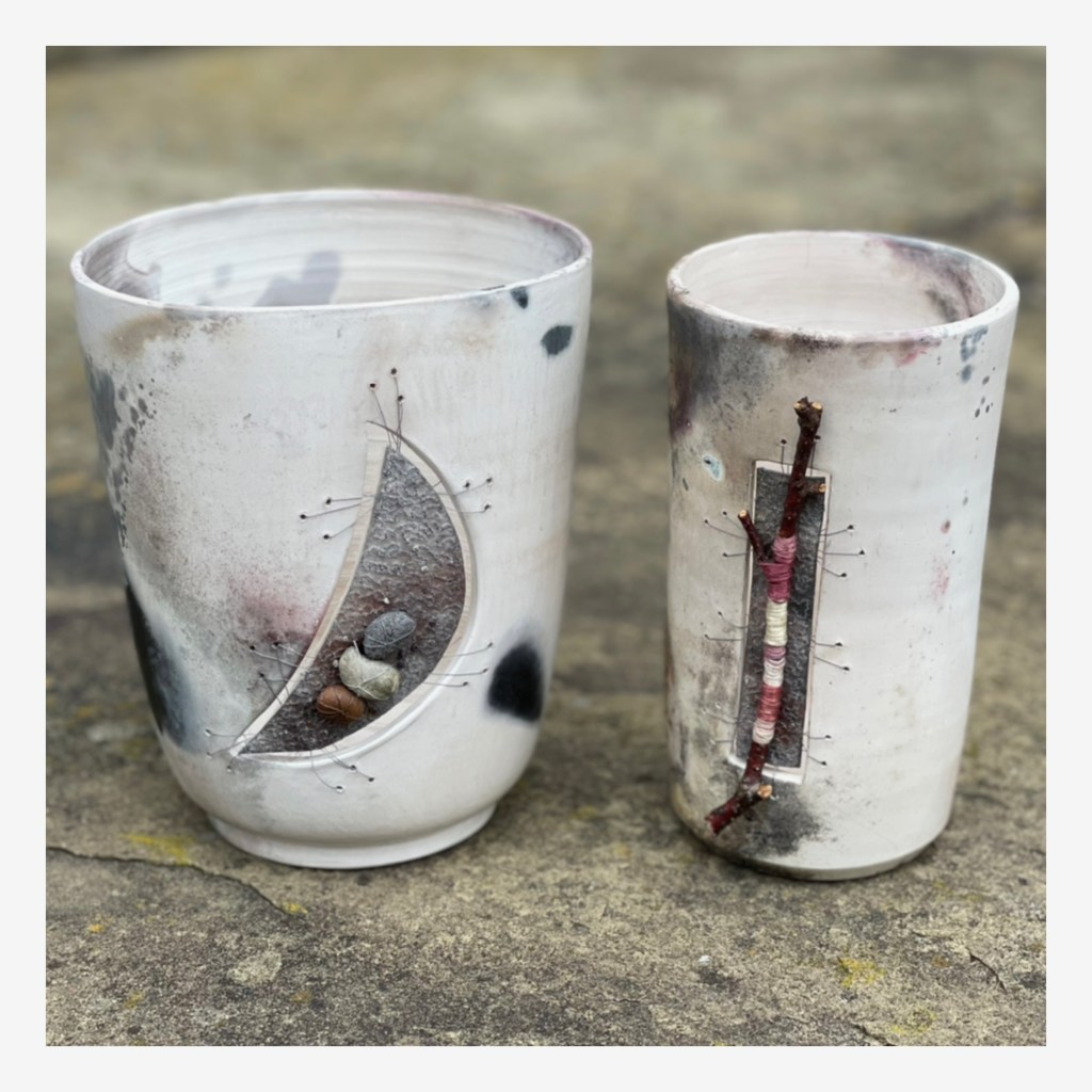 I’ve also been thinking about more muted colours in a collaboration with Martine Becquet who makes wood-fired ceramic vessels; responding to the colours of the smoke to create mixed media inclusions for the pots. These are being exhibited at the moment and we hope to work together more in future.
