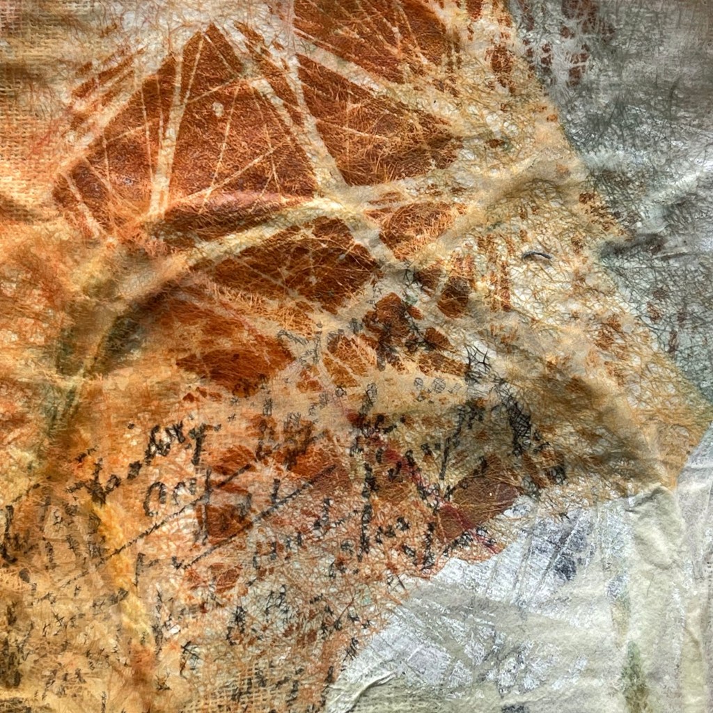 I’m just having a play with some fabric and constructing ‘paper cloth’. The base is muslin which gives it strength and papers and yarns are layered and trapped on top. A first layer of paint and ink is applied wet then left to dry so it can be build on and finally stitched into. Really not sure how this will work out but the potential is there for the piece of work I have in mind. This piece has been floating around in my head for years and I want to get it out. It’s had more sampling and potential formats than I can remember but I’m sensing this is getting closer – I hope to show you some results soon.