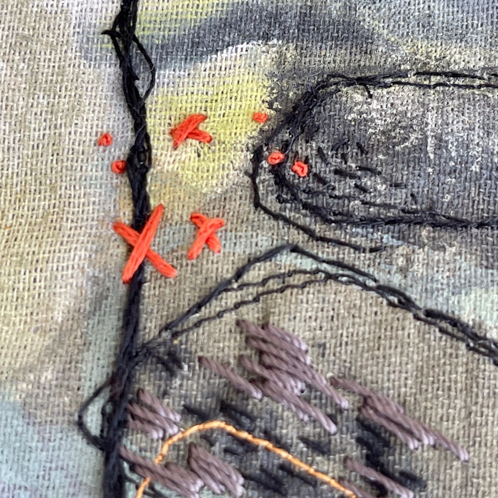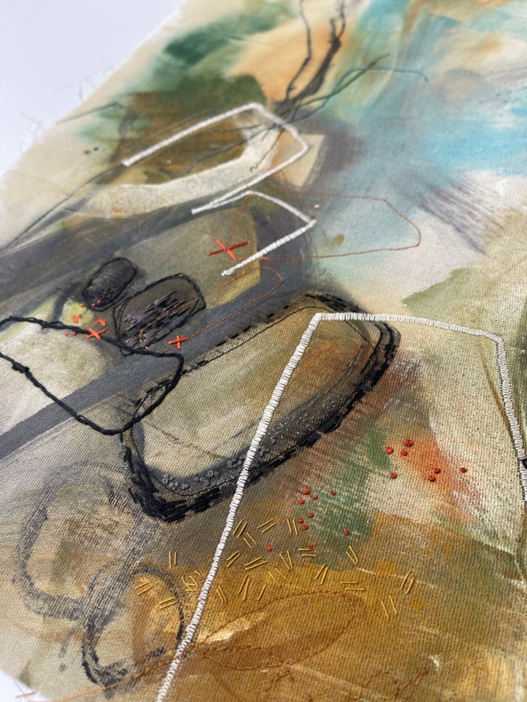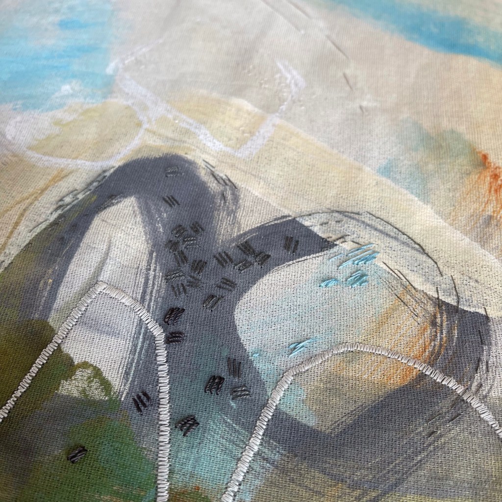 In the end, I quite enjoyed bringing these elements out via stitch in this new area. I like smaller parts rather than the whole which is because I wasn’t working on the best composition. I was curious if stitching into it would improve it but I think only large areas of paint, machining or appliqué would be enough do that. It needed better painty ‘bones’ at the start.