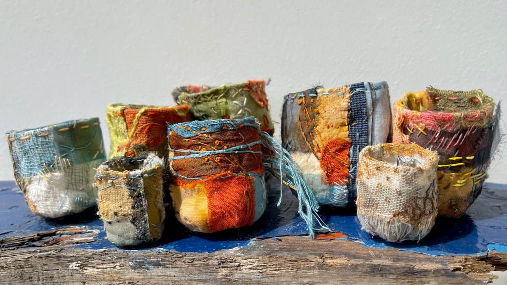 Wow! I love these “cups” or “pots” – would love to know how you made them – I am a mixed media artist and have started exploring with fabrics and slow stitching –
