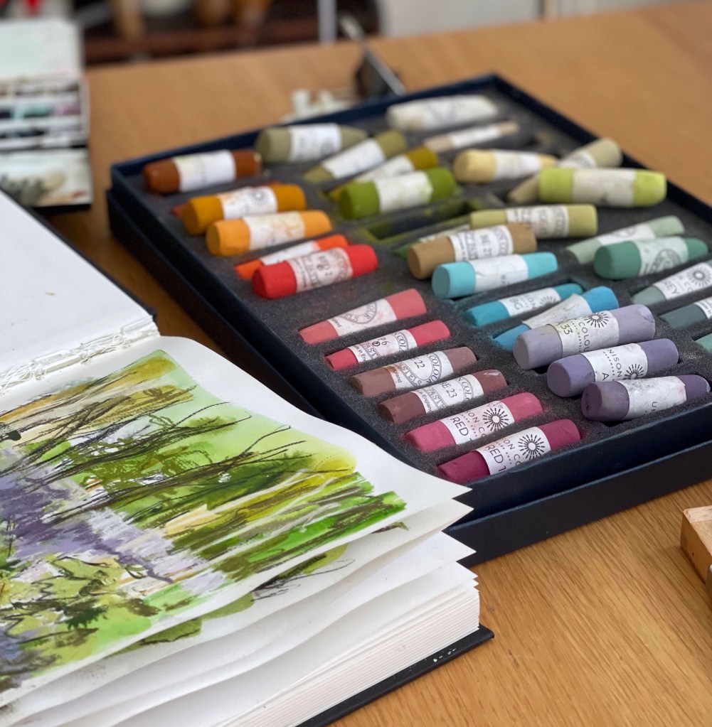 I had a huge treat for my birthday which was a set of Unison pastels. They are delicious and the colours are amazing. You know that thing when you just have a box of something you want to look at and stroke…? I took a set of other pastels I’ve had many years to my local art shop, told them I may be some time as I was picking colours I didn’t already have, and promptly sat on the floor for about 20 minutes in heaven choosing from a set of wooden drawers full of temptation.