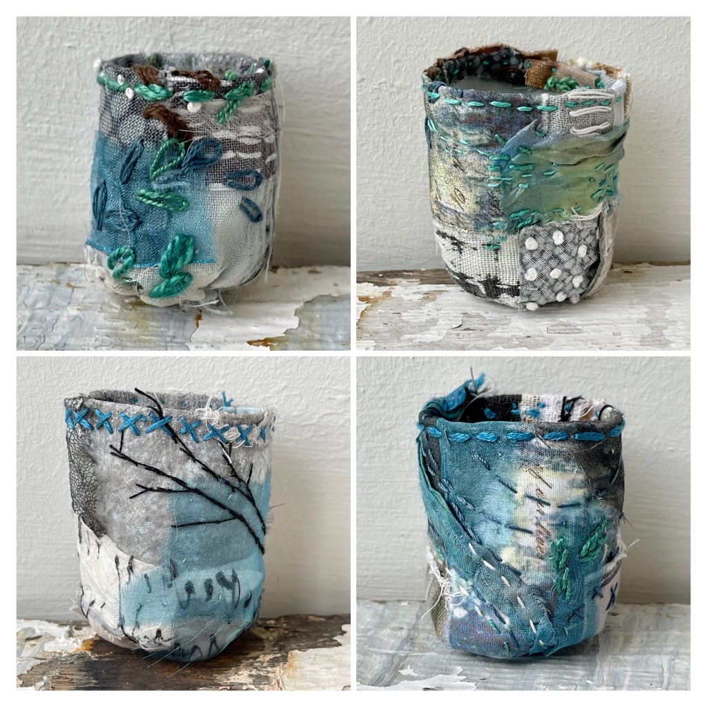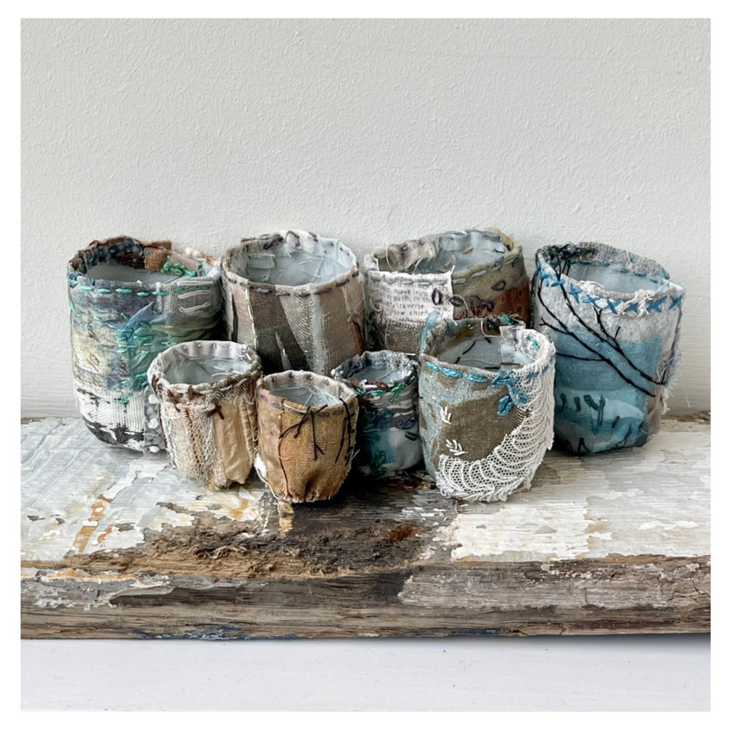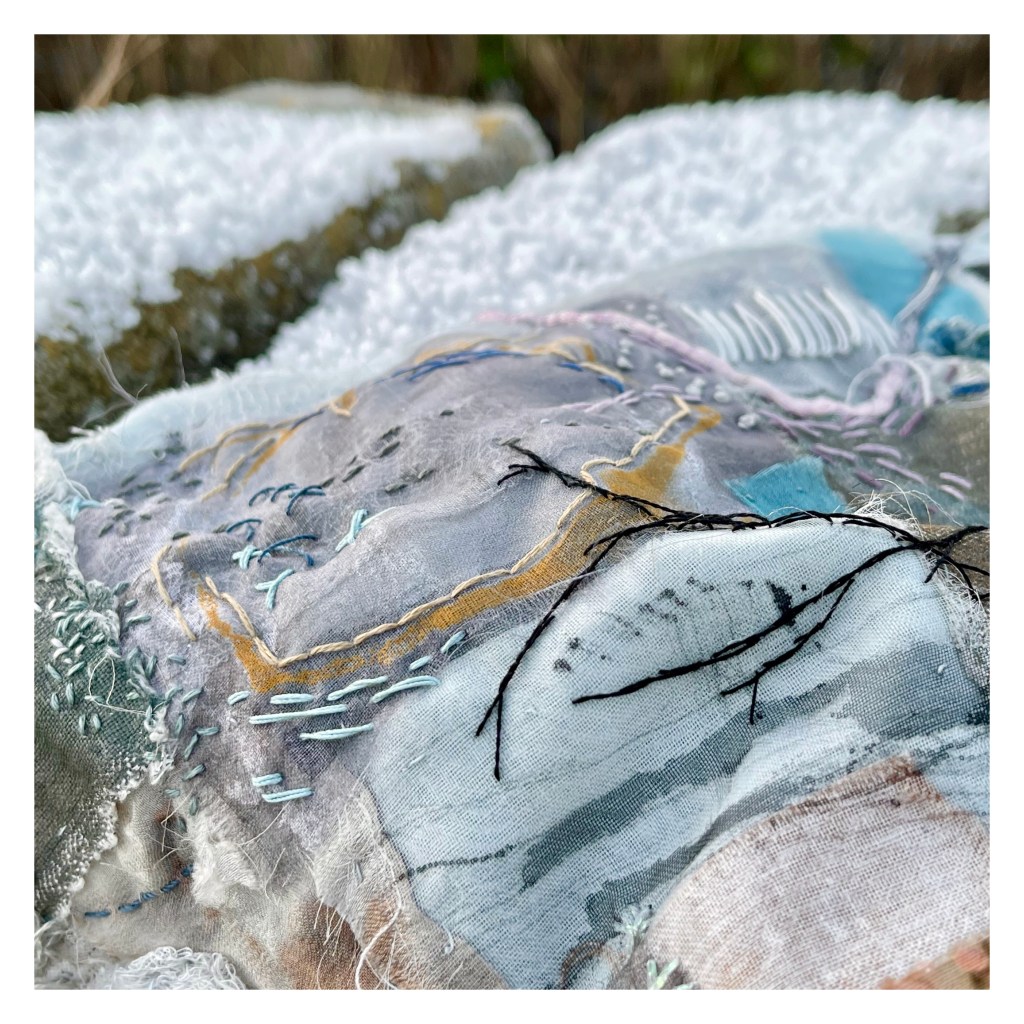 But… we had a very cold snap in December which happily coincided with some wintery slow-stitching. It’s always particularly pleasing to create work which directly reflects the current moment and although I had planned a winter set of Stitchpots, serendipity obliged.
