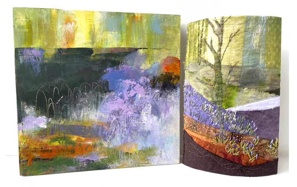 ‘Into the Woods’ 10×10 mixed media on cradled board, and textile vessel