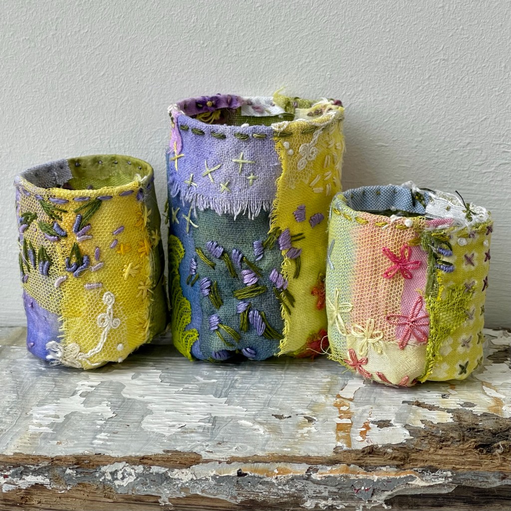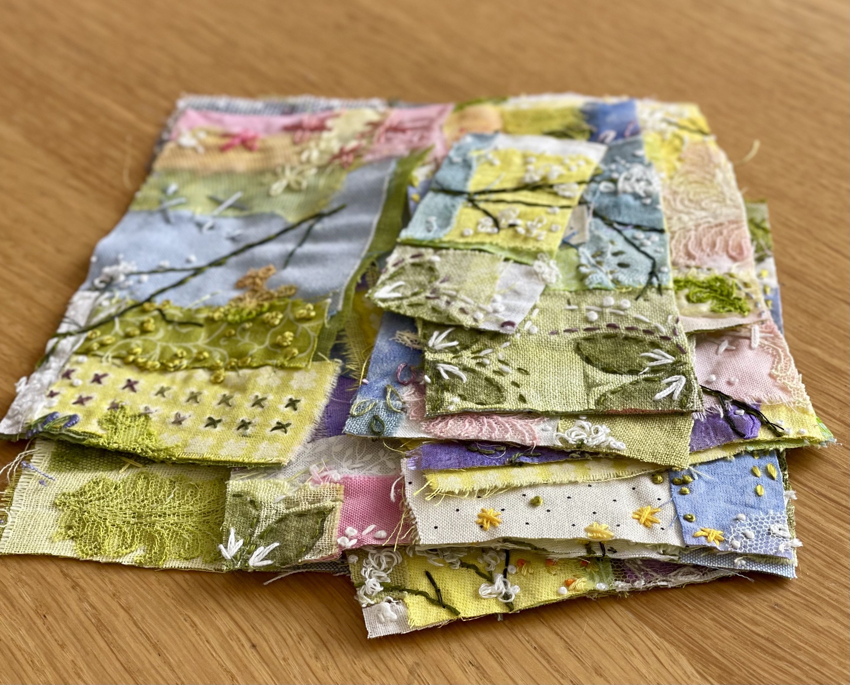 I started making the last of my seasonal Stitchpots so that I could be stitching the season as it happened. It’s been a joy to mirror the seasons this way and align creativity with nature’s clock. The Spring colour palette is probably my least favourite if I’m honest, but there is always happiness in finding colours that sing together no matter what they are. (I can’t do a lot of pink though – I had to pull some of these snippets off and replace with blues and yellows before I started stitching!). I’m still making the tiny pots up but I have a few that are finished so here are some photos from the process: