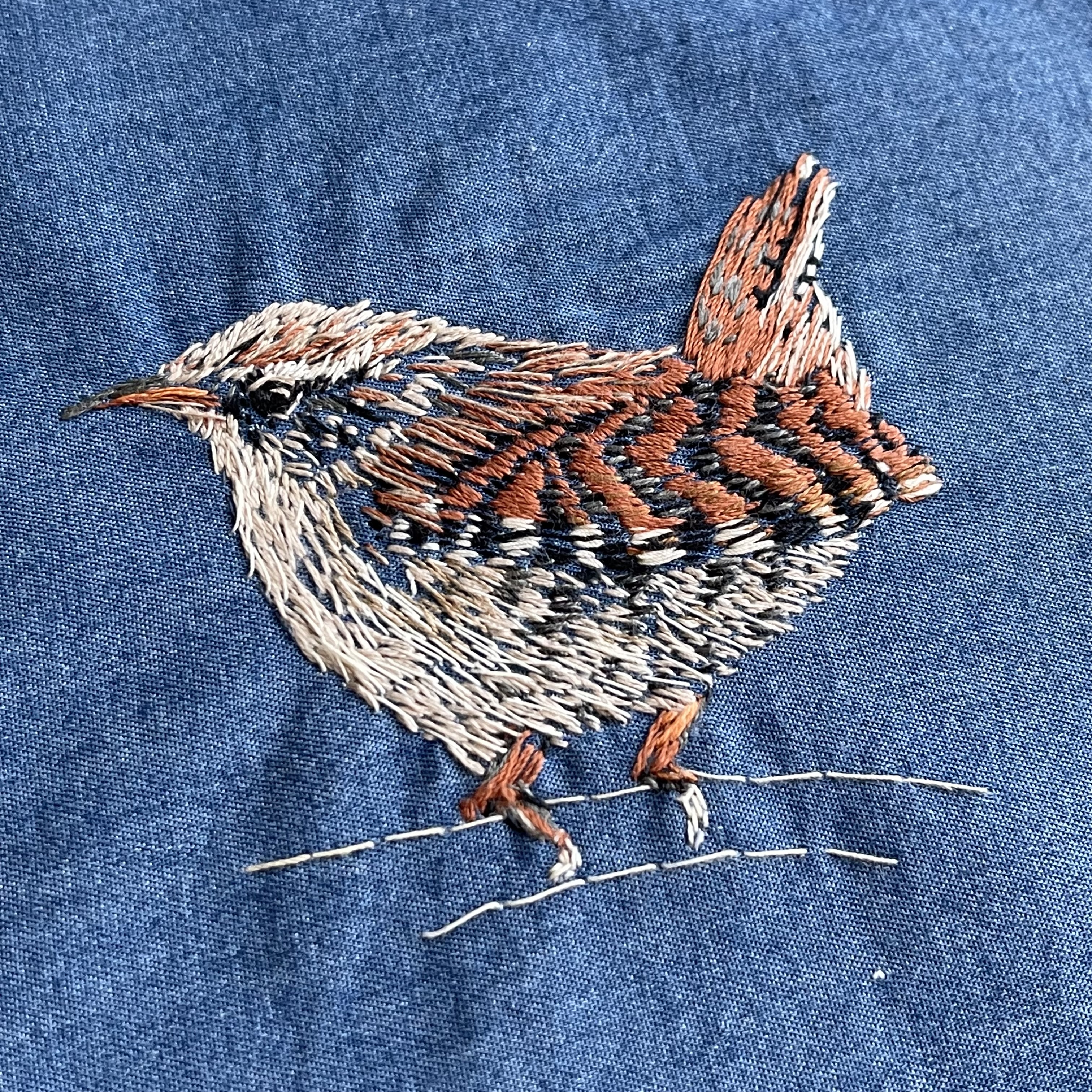 Since then, I have delivered a square to Sue Brown for ‘Same Sea Different Boat’ as the quilt continues to grow and is shown around the county. The wren was partly because Sue gave me one from her demos, but then it seemed apt as a pandemic memory because one of the nice things amongst the misery was being able to hear birdsong that first lockdown Spring as the traffic ceased. I love the dawn chorus this time of year and often open my window for a minute to hear it as I’m a ‘lark’ as they say.