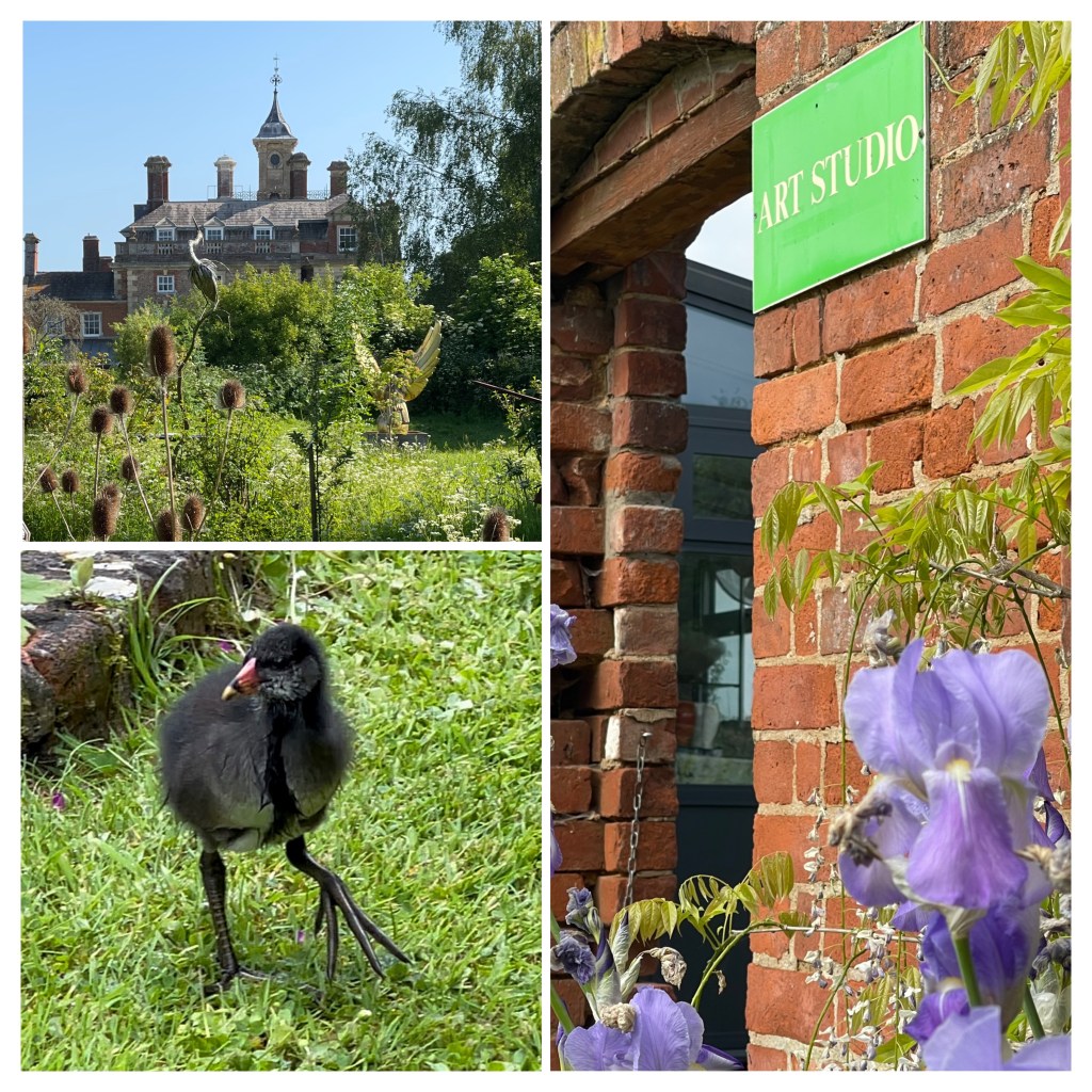 Working at Nature in Art is such a joy. I’m serenaded by the robin each morning, I can watch the cows come bouncing into the field behind and there are a myriad of birds nesting in the walls and sculptures! Baby moorhens potter about with their ridiculously huge feet. The weather is stunning and it all lifts my spirit.