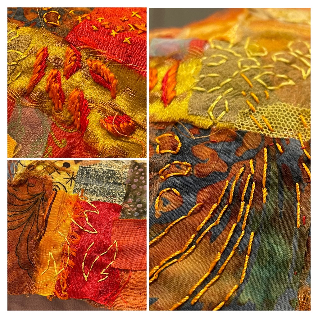 The other thing I’ve started is a set of stitch-cloths based on the elements. I’ve chosen fire to start with – it seemed apt with Autumn and bonfire night etc. The cloth will eventually become tiny pots (of course!) and it gives me something to do particularly in the dark evenings. I’ve struggled a bit finding motifs and ways to represent fire but I thought I’d just start and see what happened. Now that I’ve made a start, something is coming more easily. Often the way!