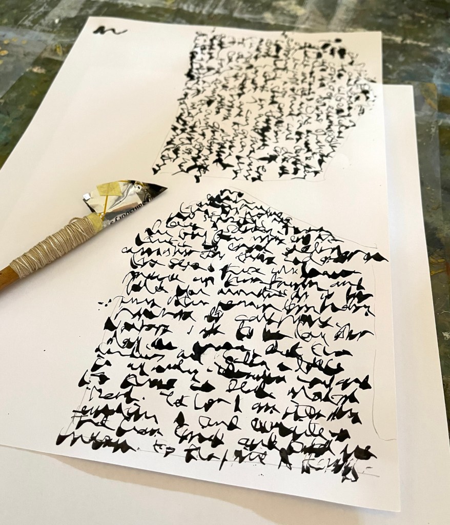 They are also born out of the turmoil of trying to move house and the ups and downs of the last two years. One minute thinking we are going, the next readjusting to staying, and all the utterly frustrating paperwork and legal processes. On the backs, I’m scribbling a whole tirade of thoughts and emotions in aesemic writing which will be trapped when the piece comes together – it’s cathartic and of the moment.