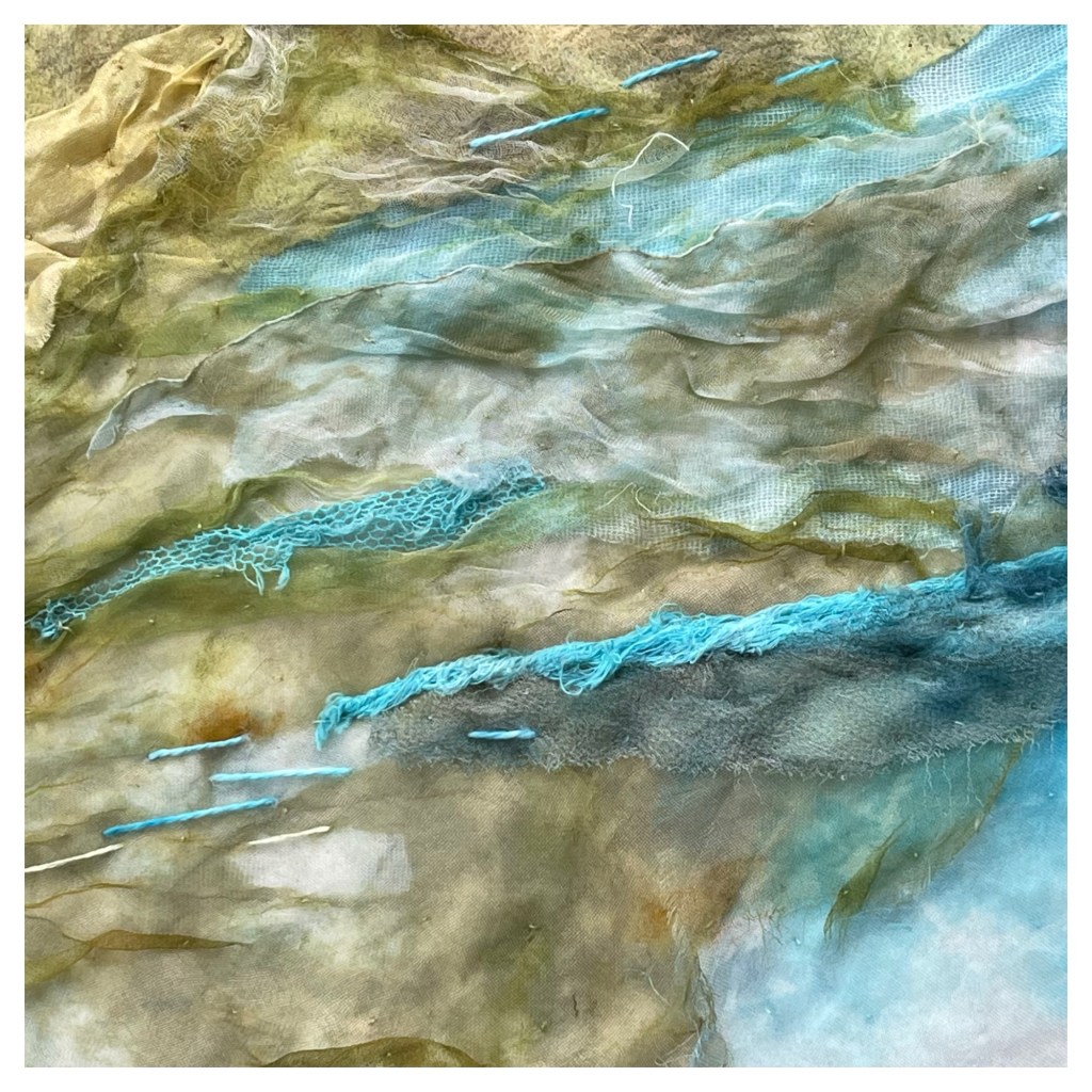 I’ve had a chesty lurg to contend with the last couple of weeks but that’s moving out of the way thankfully and I’m working away to finish my piece about rivers.  It’s getting towards the end now when I will need to neaten and back it.  It’s really hard to show it as one long piece but hopefully in the new year I can attempt a photo or two.  I just suddenly thought ‘that’s it, I’m done now’.   I hadn’t realised but it’s been keeping me company on and off since early August and it’s grown in length to about 5m.  Here are a couple more close-ups of it and a fat roll which is how I keep it behaving itself 😄