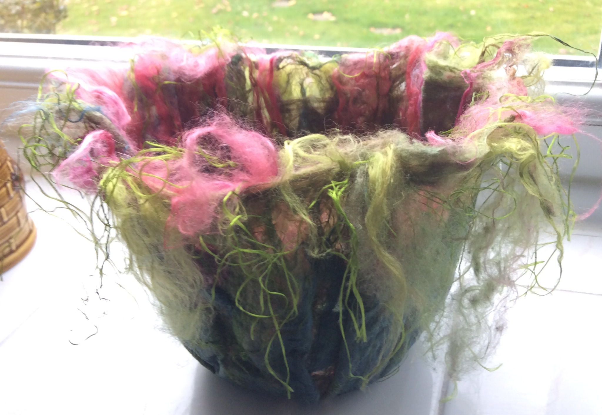 This is my silk paper vessel, this took some doing. Lots of layers, re-layering, getting it off bowls when it was stuck, re-shaping it in other bowls until it looked fairly presentable. I have a lot to learn about using silk fibres but it was an experiment and I enjoyed it for that, which is what it’s all about!